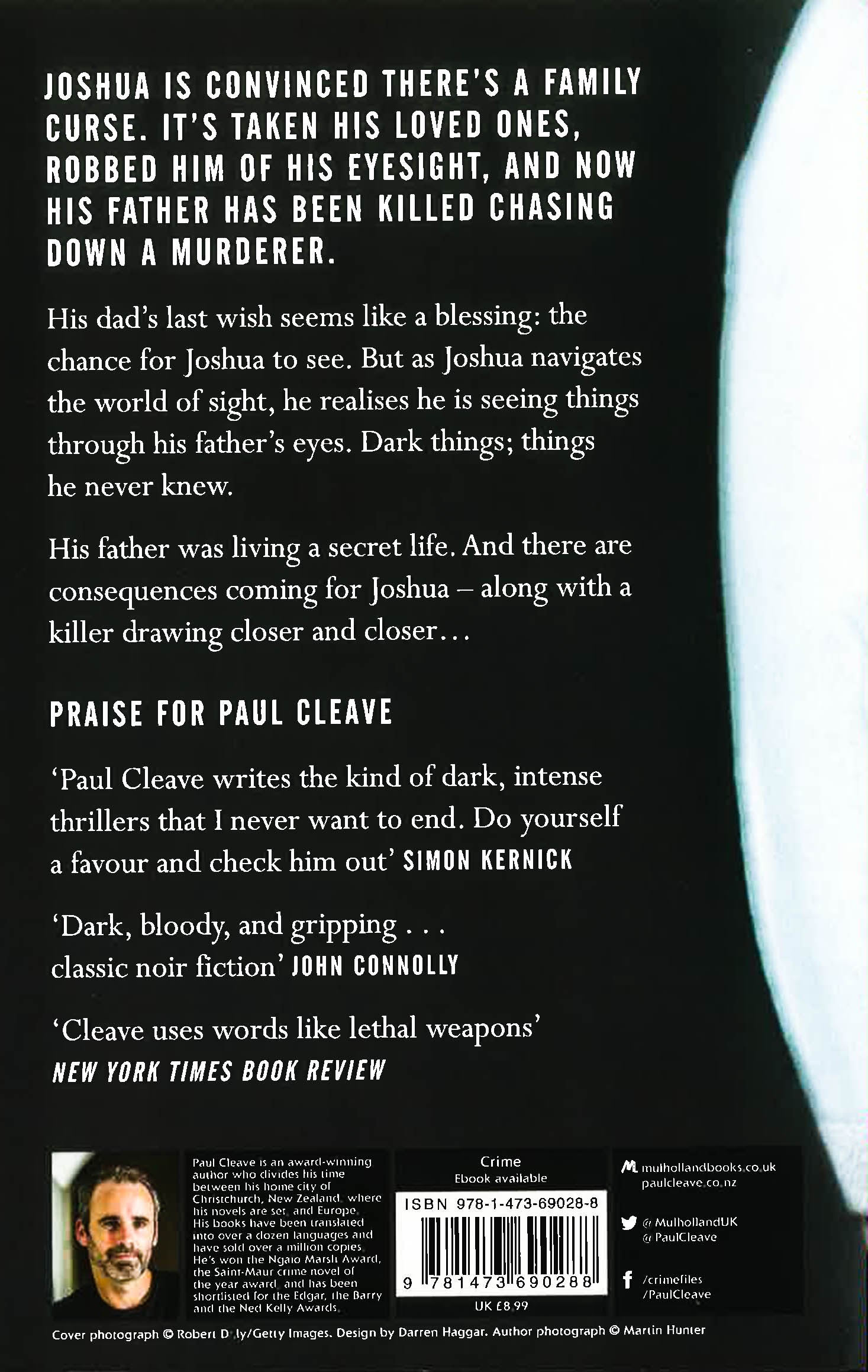 Joshua is convinced there's a family curse.It's taken his loved ones, robbed him of his eyesight, and now his father has been killed chasing down a murderer. His dad's last wish seems like a blessing: the chance for Joshua to see. But as Joshua navigates the world of sight, he realises he is seeing things through his father's eyes. Dark things; things he never knew. His father was living a secret life. And there are consequences coming for Joshua - along with a killer drawing closer and closer...PRAISE FOR PAUL CLEAVE'Paul Cleave writes the kind of dark, intense thrillers that I never want to end. Do yourself a favour and check him out.' Simon Kernick'Anyone who likes their crime fiction on the black and bloody side should move Paul Cleave straight to the top of their must-read list.' Mark Billingham'Riveting and all too realistic. Cleave is a writer to watch.' Tess Gerritsen
