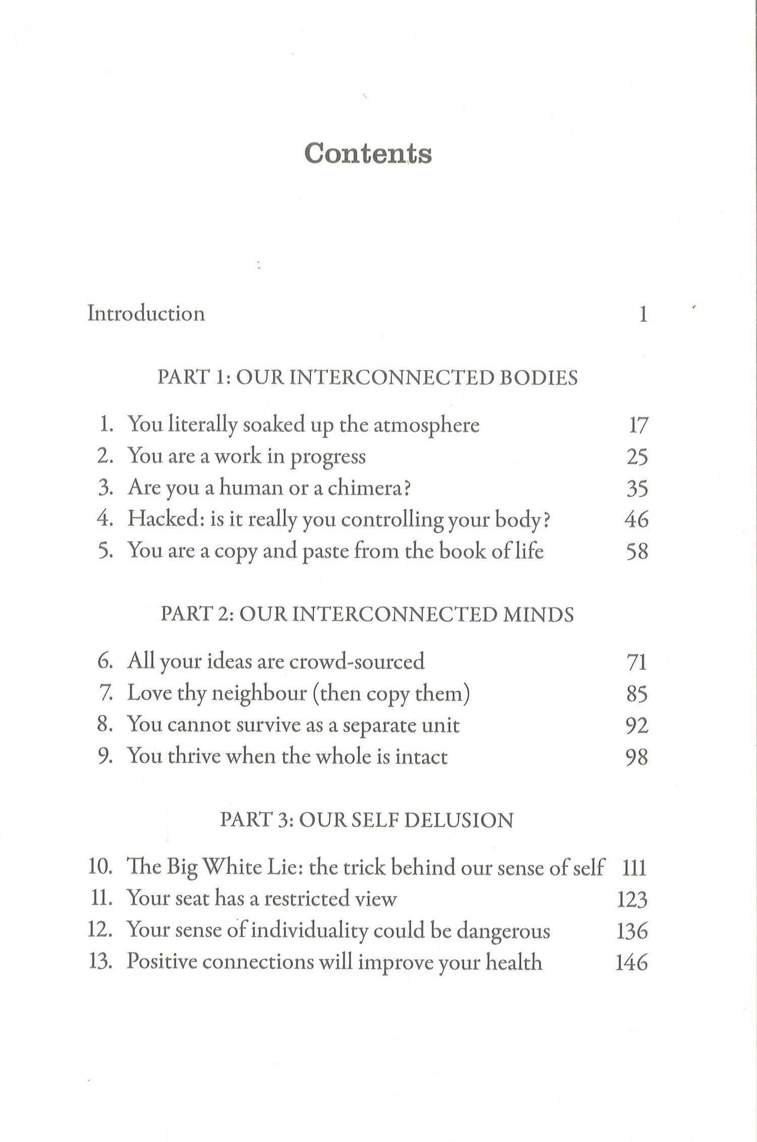 On a physical, psychological and cultural level, we are all much more intertwined than we know: we cannot use our bodies to define our independent existence because most of our 37 trillion cells have such a short lifespan that we are essentially made anew every few weeks; the molecules that make up our bodies have already been component parts of countless other organisms, from ancient plants to dinosaurs; we are more than half non-human, in the form of bacteria, fungi and viruses, whose genes influence our moods and even manipulate our behaviour; and we cannot define ourselves by our minds, thoughts and actions, because these mainly originate from other people - the result of memes passing between us, existing before, after and beyond our own lifespans.