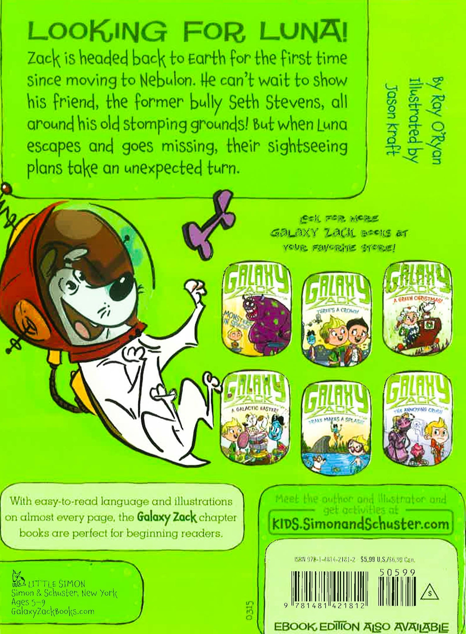 Zack is headed back to Earth for the first time since moving to Nebulon. He can't wait to see his best friend Bert and show his new friend, the former bully Seth Stevens, all around his old stomping grounds! Luna's excited too. A little too excited. When the pooch escapes and goes missing, sightseeing plans take an unexpected turn. Will Zack find Luna before he has to head home to Nebulon?