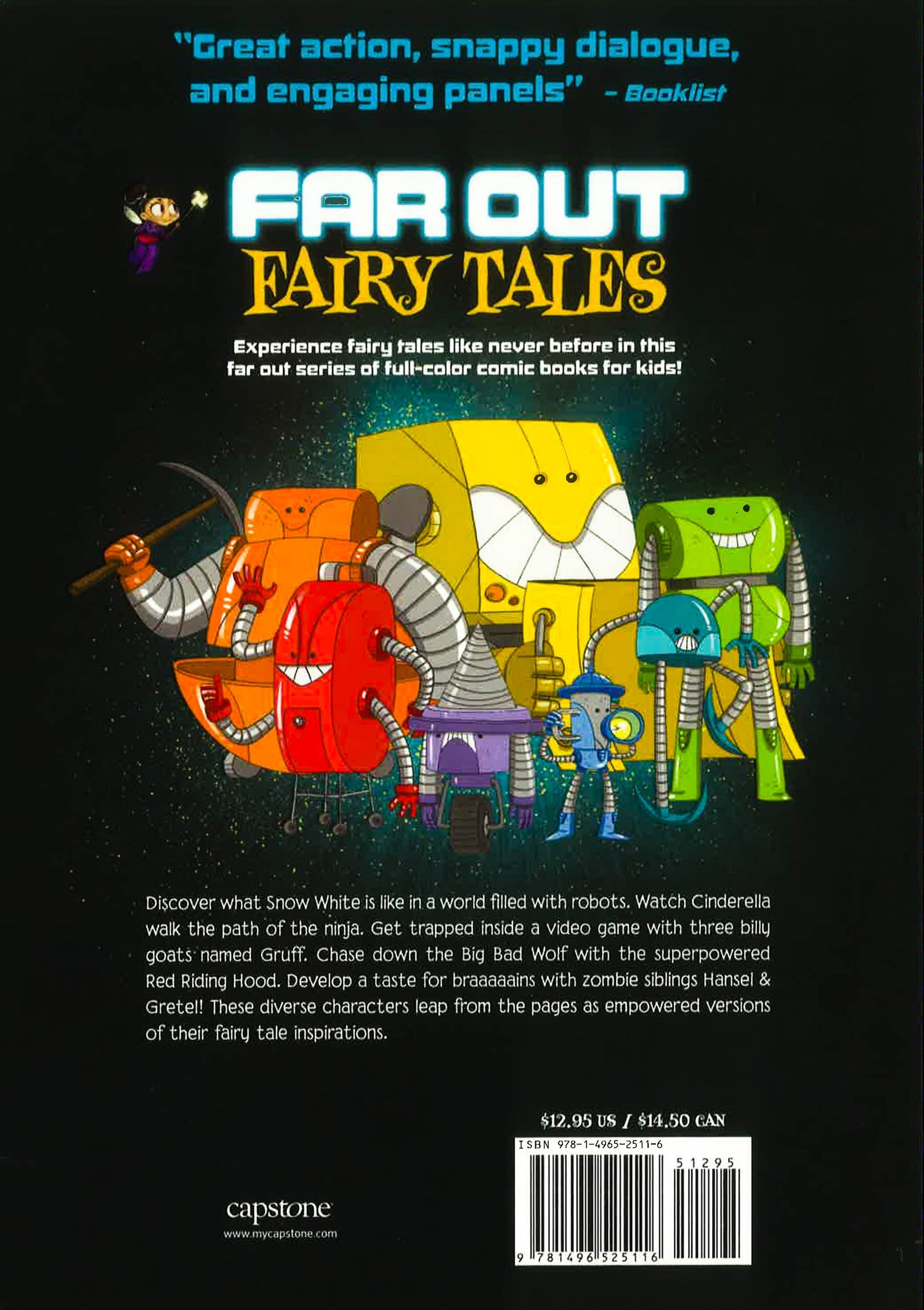 What do you get when classic fairy tales are twisted about, turned inside out, and reworked for the graphic novel format? Far Out Fairy Tales! Discover what Snow White would be like if she were raised by robots. Find out how Cinderella's story plays out when she walks the path of the ninja. Play along when three billy goats named Gruff get stuck inside a video game. Chase down the Big Bad Wolf with the help of a superpowered Red Riding Hood! Each fairy tale revision holds true to the spirit of the original while adding a modern twist to the classic tales we know and love. Experience fairy tales like never before in this innovative series of full-color comic books for kids!