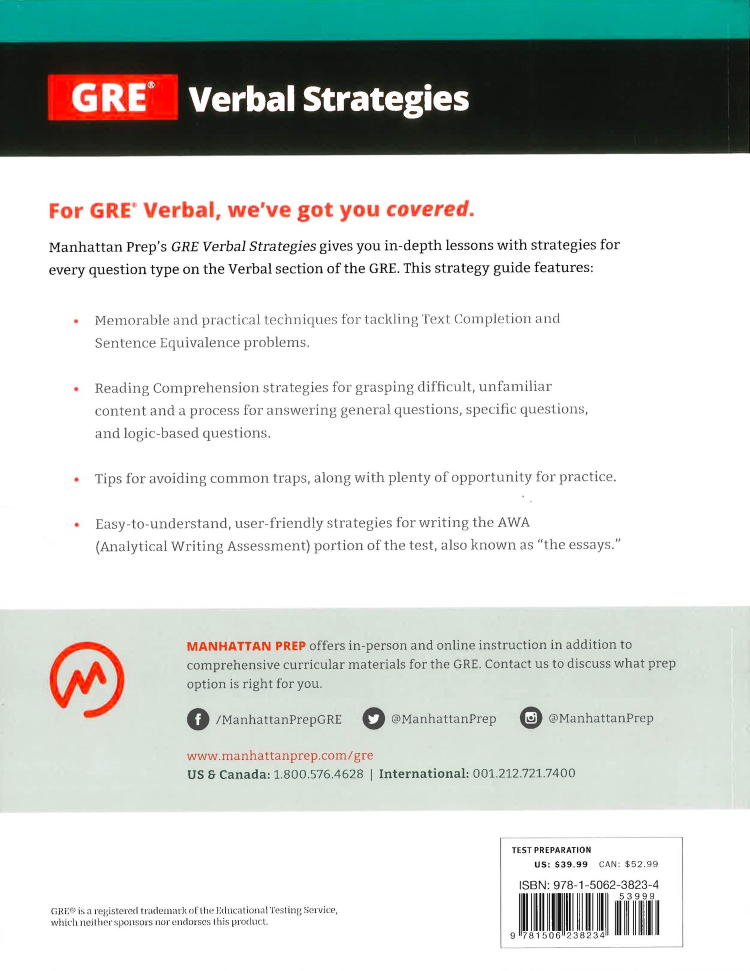 Please note: The content in the new Manhattan Prep GRE Verbal Strategies is an updated version of the verbal content in the Manhattan Prep GRE Set of 8 Strategy Guides.Written and recently updated by our 99th percentile GRE instructors, Manhattan Prep's GRE Verbal Strategies features in-depth lessons covering strategies for every question type on the Verbal section of the GRE. Included in this comprehensive guide are memorable and practical techniques for efficiently tackling Text Completion and Sentence Equivalence problems. In the Reading Comprehensions chapters, you will learn strategies for grasping difficult, unfamiliar content and a process for answering general questions, specific questions, and logic-based questions. Throughout the guide you will find tips for avoiding common traps, along with plenty of opportunity for practice via problem sets followed by detailed answer explanations written by GRE top-scorers. The guide also includes easy-to-understand, user-friendly strategies for writing the AWA (Analytical Writing Assessment) portion of the test, also known as "the essays."