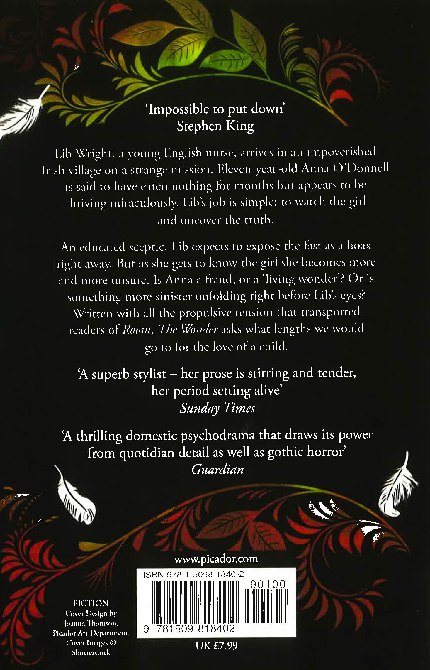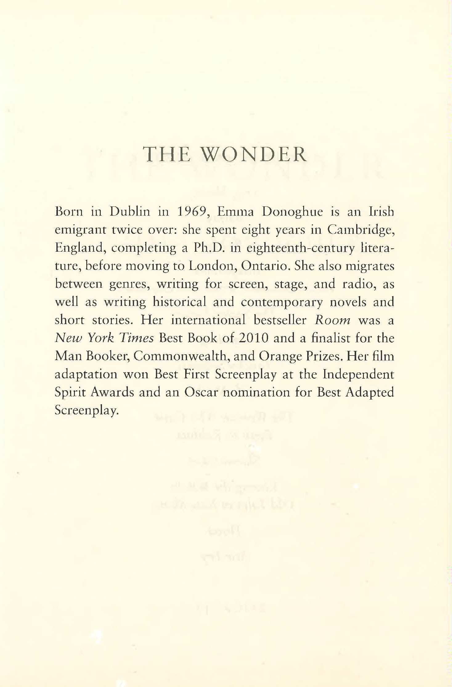 Set in the Irish Midlands in the 1850s, Emma Donoghue's The Wonder - inspired by numerous European and North American cases of 'fasting girls' between the sixteenth century and the twentieth - is a psychological thriller about a child's murder threatening to happen in slow motion before our eyes. Pitting all the seductions of fundamentalism against sense and love, it is a searing examination of what nourishes us, body and soul.