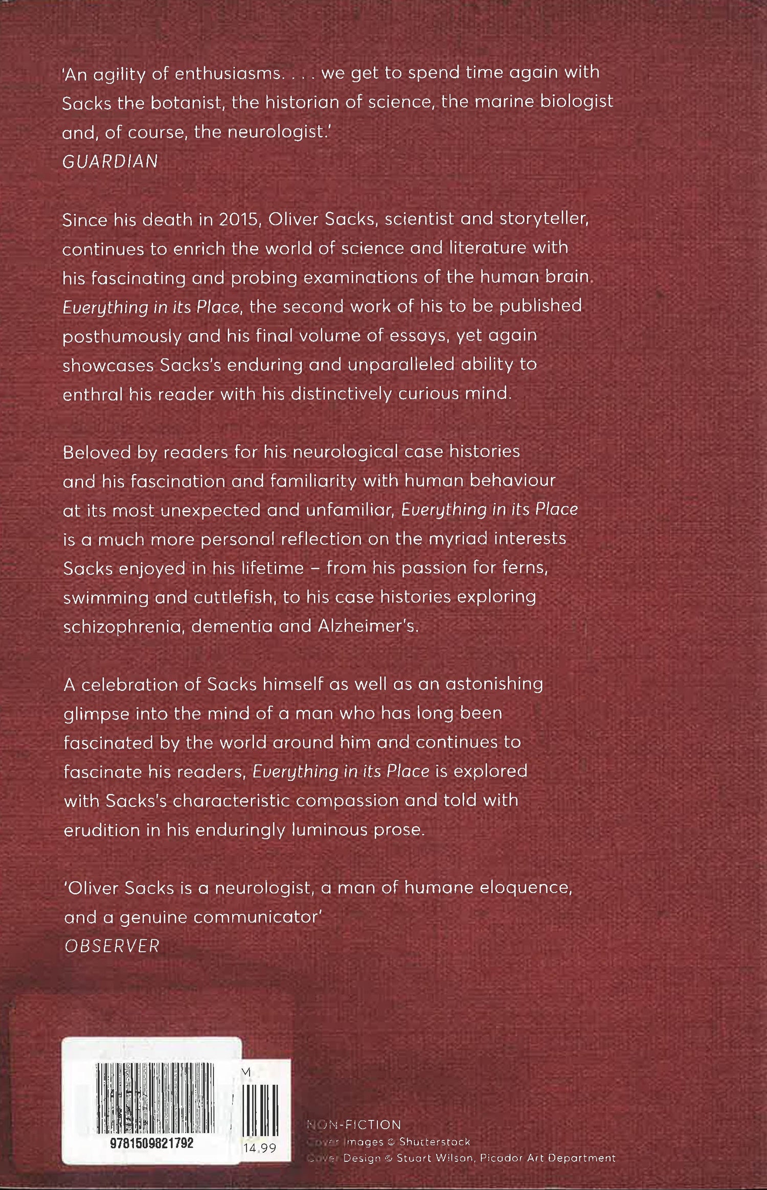 Oliver Sacks, scientist and storyteller, is beloved by readers for his neurological case histories and his fascination and familiarity with human behavior at its most unexpected and unfamiliar. Everything in Its Place is a celebration of Sacks's myriad interests.