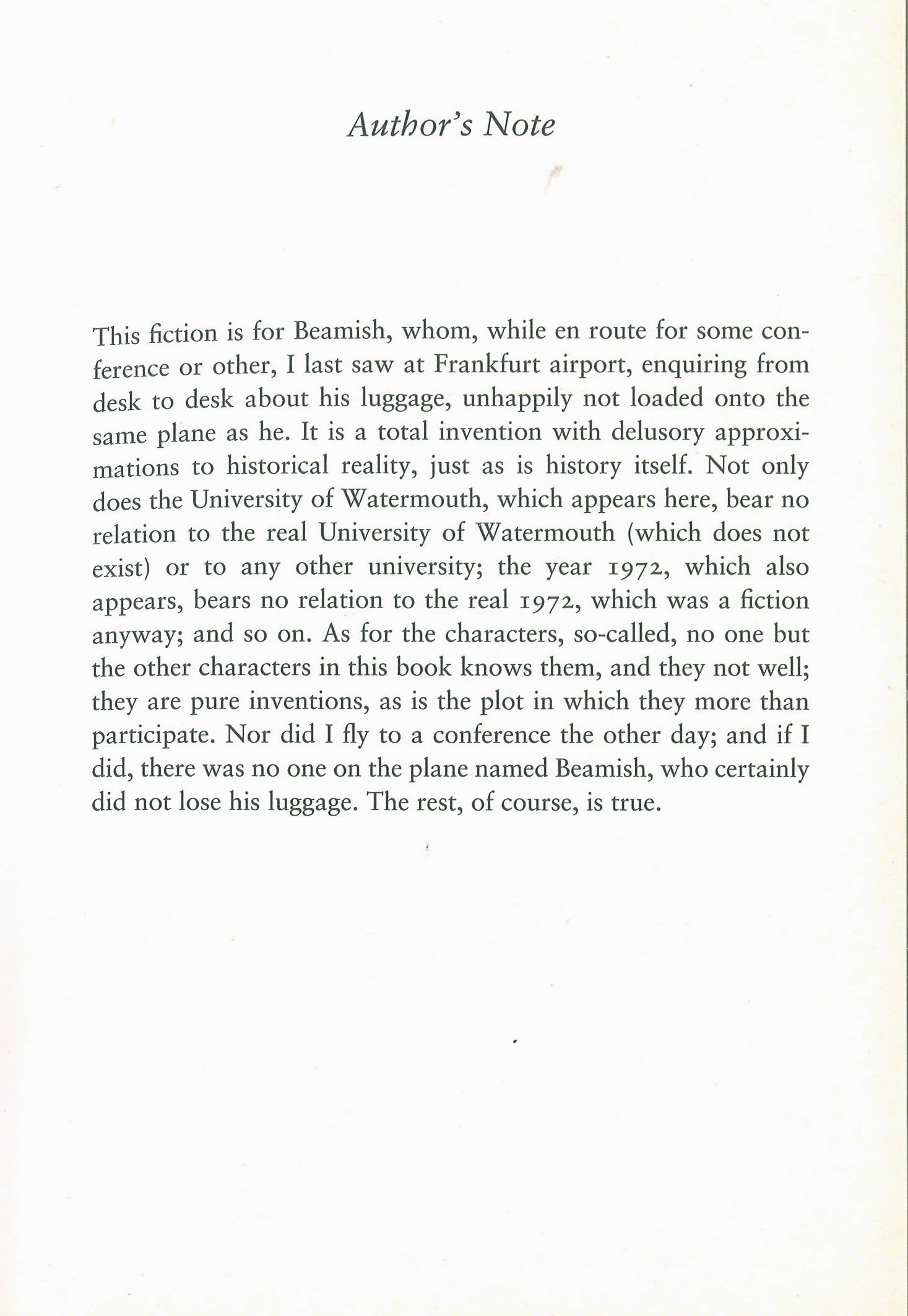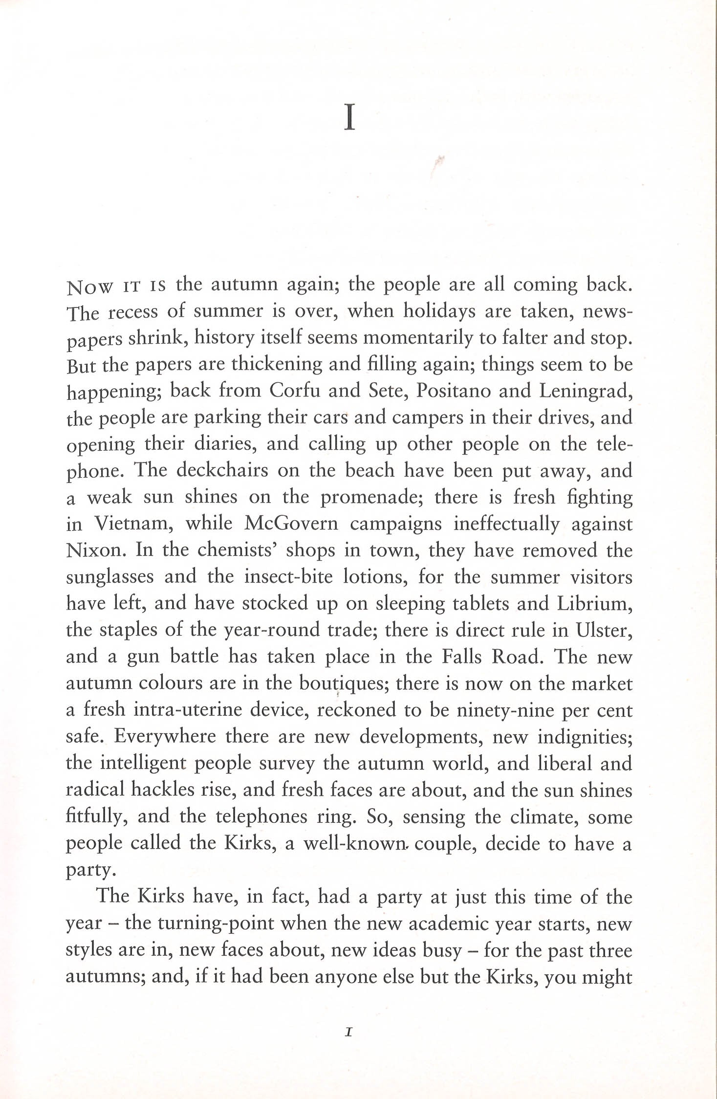Howard Kirk, product of the Swinging Sixties, radical university lecturer, and one half of a very modern marriage, is throwing a party. The night will have all sorts of repercussions: for Henry Beamish, Howard's desperate and easily neglected friend, and for Howard's wife Barbara, promiscuous '70s liberal and exhausted victim of motherhood.