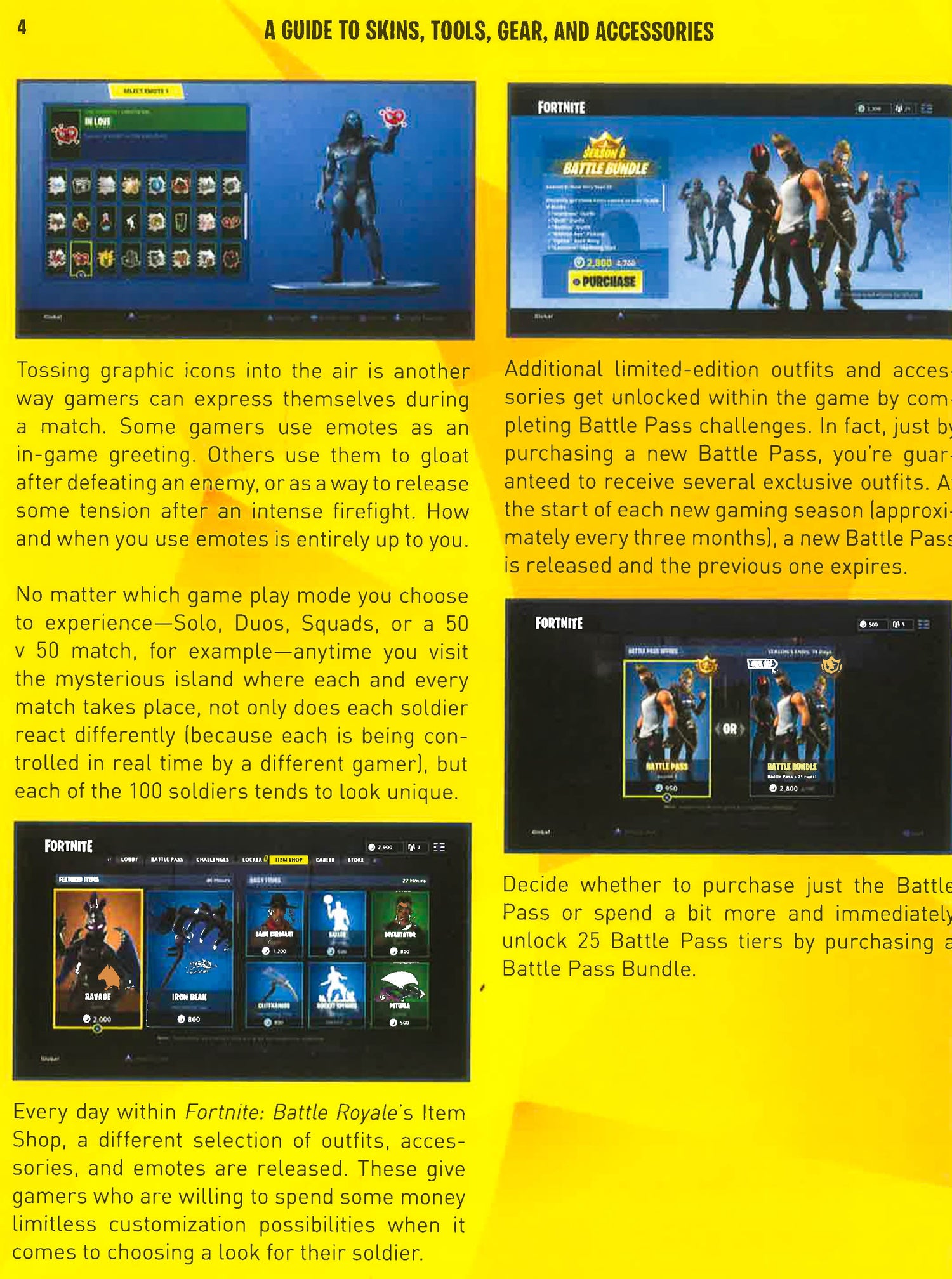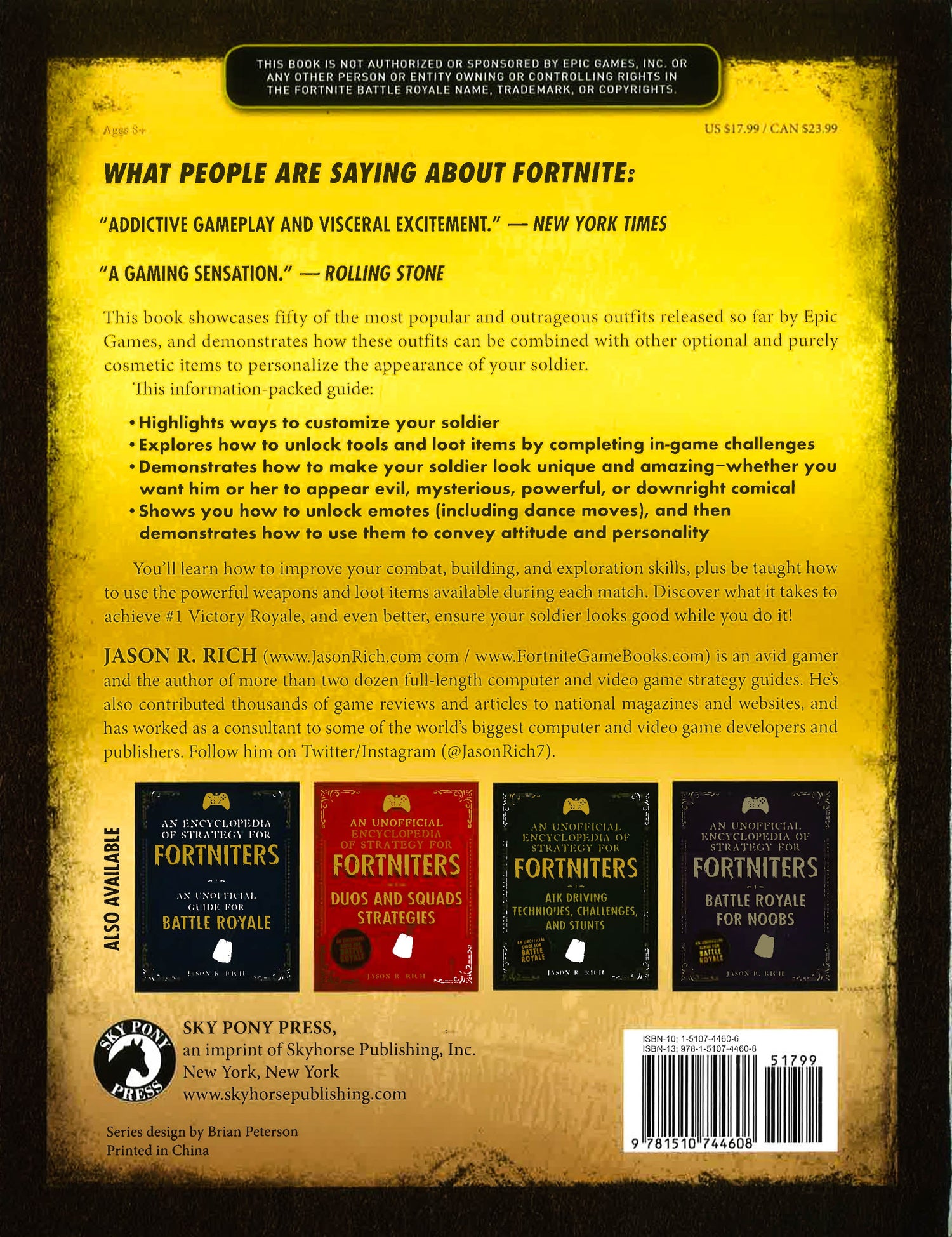 An Unofficial Encyclopedia of Strategy for Fortniters: A Guide to Skins, Tools, Gear, and Accessories will showcase some of the most popular, rare, limited-edition, and most outrageous outfits thus far released by Epic Games and demonstrate how these outfits can be combined with other optional and purely cosmetic items to truly personalize a character.