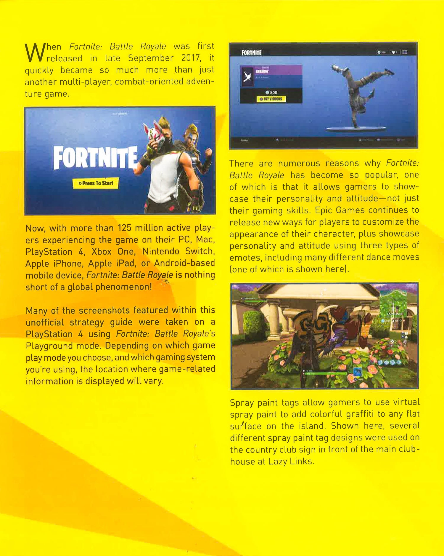 As each outfit is showcased and described, along with its related accessory items, full-color screenshots will be used so readers can see what each outfit looks like, plus see a soldier wearing that outfit and using the related items within different in-game scenarios. As these scenarios are shown, readers will discover game-play tips and strategies they can utilize when playing Fortnite Battle Royale on any compatible gaming system.