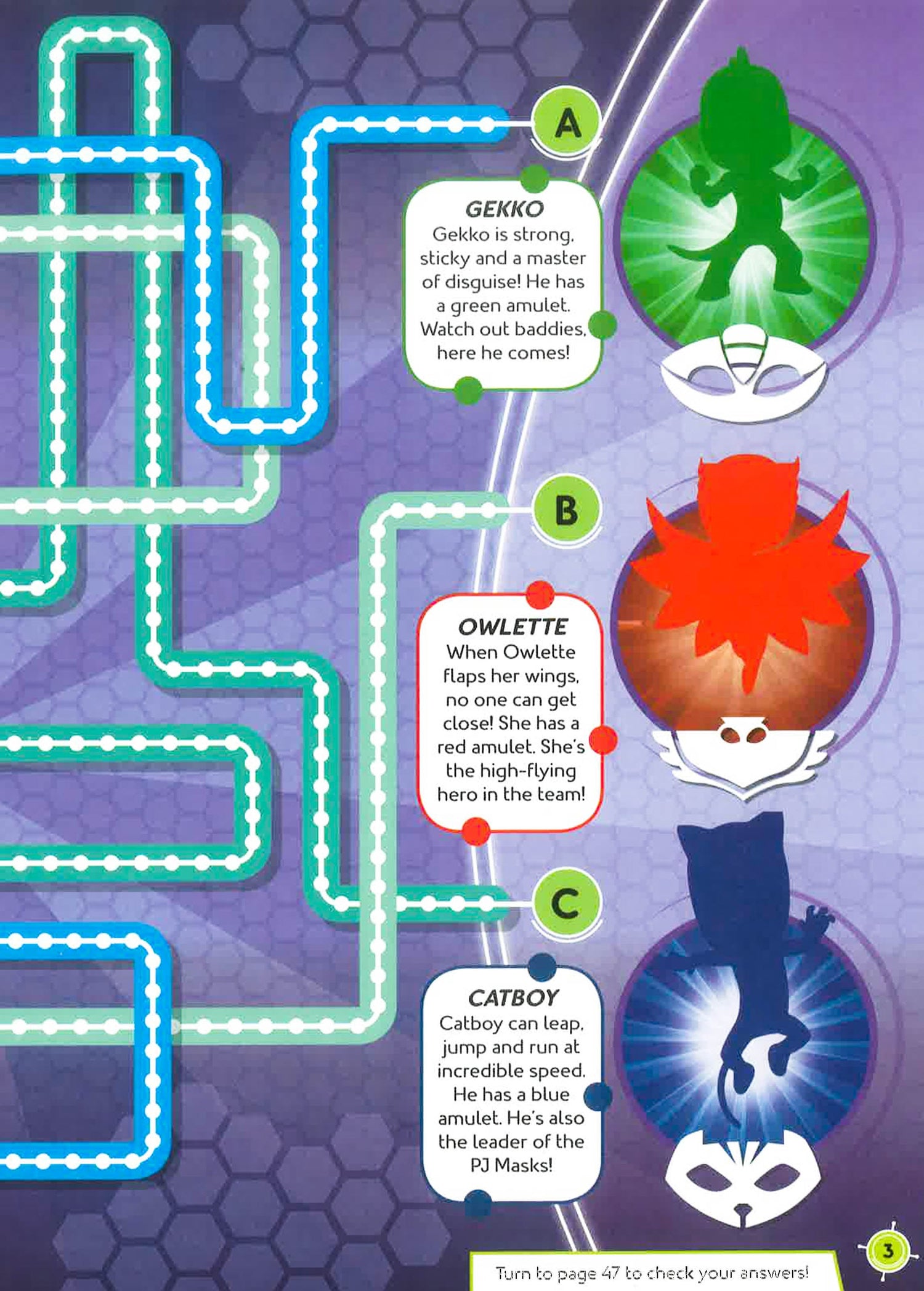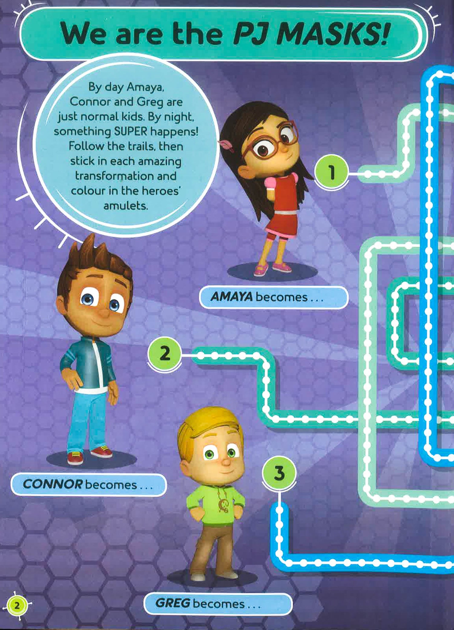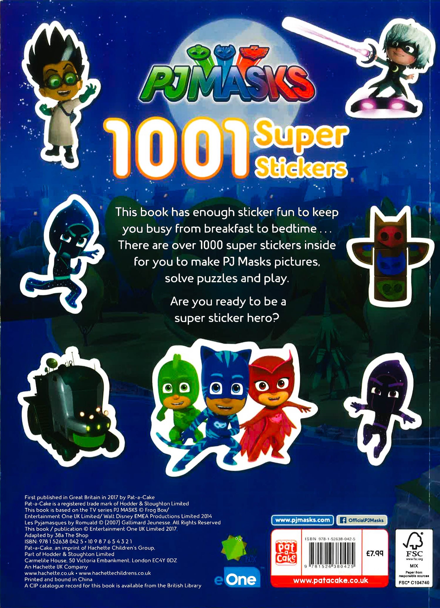 By day, they are Connor, Greg and Amaya, but by night they are Catboy, Gekko and Owlette, the PJ Masks. This mega sticker book has over 1000 stickers of the heroes, their vehicles and the villains and vital information about all of them, jam-packed into pages of super exciting puzzles, games and activities for hours and hours of PJ Masks fun. Can you help the PJ masks to defeat the baddies? It's time to be a hero!PJ Masks (c) Frog Box / Entertainment One UK Limited / Walt Disney EMEA Productions Limited 2014