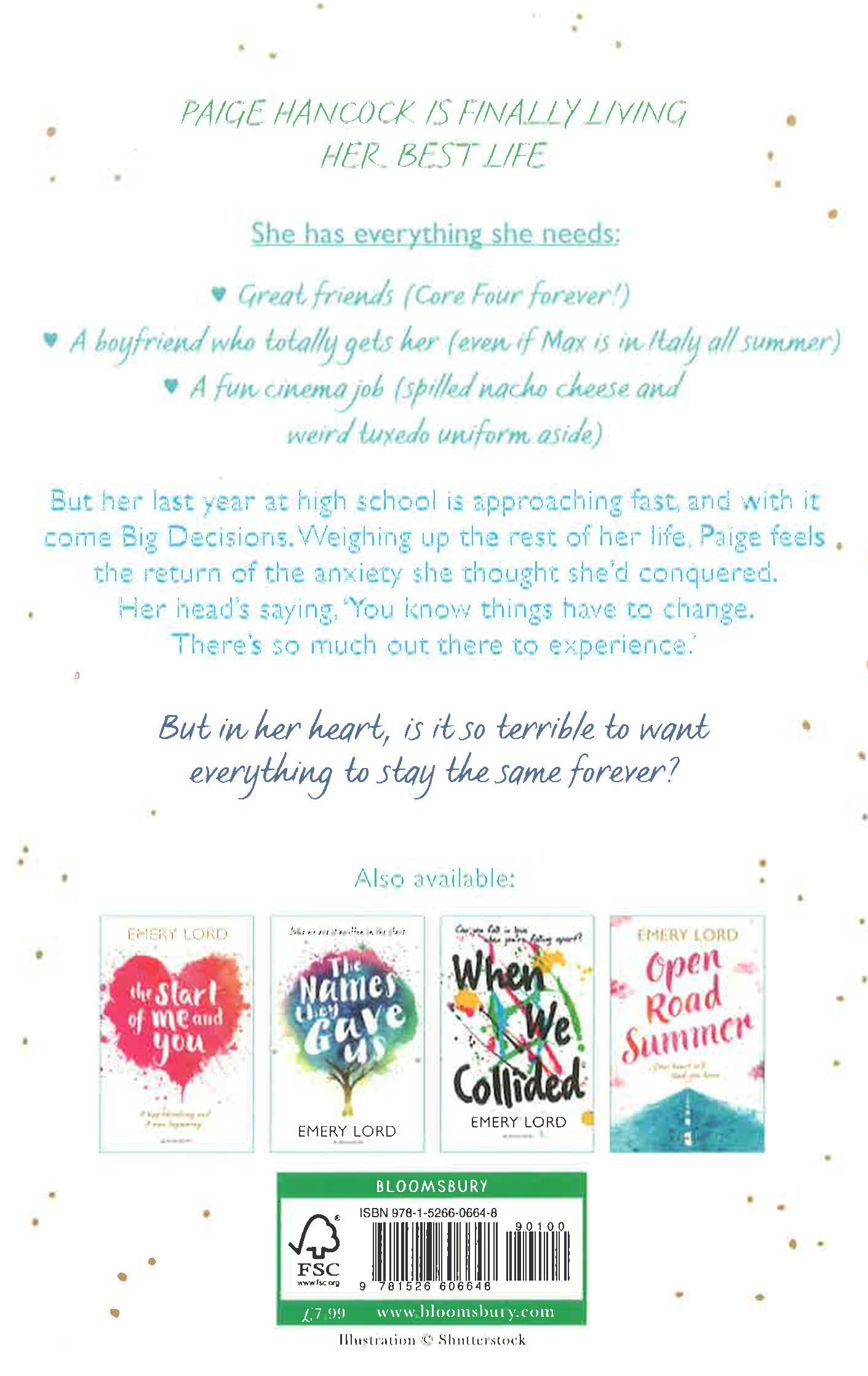 It's senior year, and Paige Hancock is finally living her best life. She has a fun summer job, great friends, and a super charming boyfriend who totally gets her. But senior year also means big decisions. Feeling the weight of 'the rest of her life' Paige starts to panic. Everything is exactly how she always wanted it to be - how can she leave it all behind next year? In her head, she knows there is so much more to life after high school. But in her heart, is it so terrible to want everything to stay the same forever?