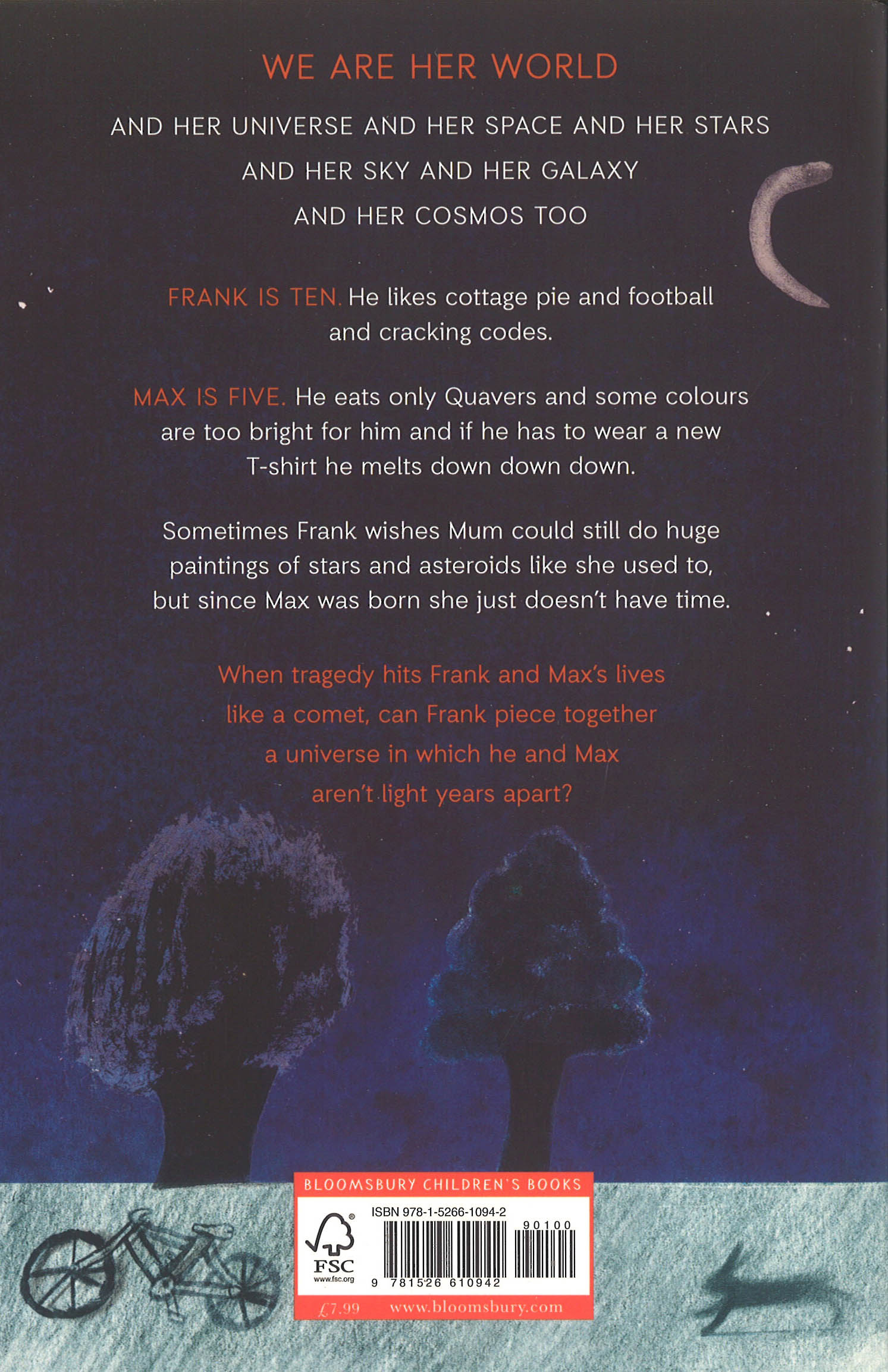 We are her world and her universe and her space and her stars and her sky and her galaxy and her cosmos too Frank is ten. He likes cottage pie and football and cracking codes. Max is five. He eats only Quavers and some colours are too bright for him and if he has to wear a new T-shirt he melts down down down. Sometimes Frank wishes Mum could still do huge paintings of stars and asteroids like she used to, but since Max was born she just doesn't have time. When tragedy hits Frank and Max's lives like a comet, can Frank piece together a universe in which he and Max aren't light years apart? This jaw-dropping, heartbreaking and hopeful novel from debut author Katya Balen will remind you we are all made of stardust. For fans of thought-provoking, moving middle grade from Wonder to Skellig