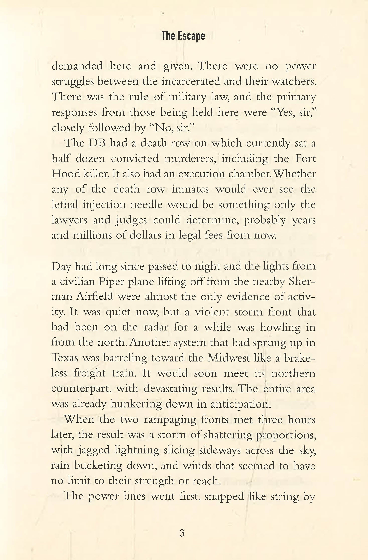 CID investigator, John Puller, has returned from his latest case in Florida to learn that his brother, Bobby, on death row at Leavenworth Prison for national security crimes, has escaped. Preliminary investigations show that he may have had help in his breakout. Now he's on the run, and in disguise, and he's the US government's number one target.