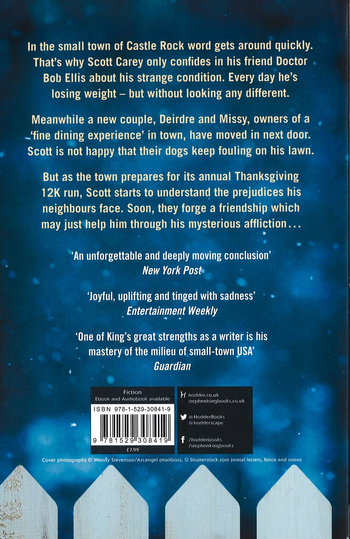 'Stephen King's slim new novel tackles weighty matters' - New York Post. Castle Rock is a small town, where word gets around quickly. That's why Scott Carey wants to confide only in his friend Doctor Bob Ellis about his strange condition: he's losing weight, without getting thinner, and the scales register the same when he is in his clothes or out of them, however heavy they are. Scott also has new neighbours, who have opened a 'fine dining experience' in town, although it's an experience being shunned by the locals; Deidre McComb and her wife Missy Donaldson don't exactly fit in with the community's expectations. And now Scott seems trapped in a feud with the couple over their dogs dropping their business on his lawn. Missy may be friendly, but Deidre is cold as ice. As the town prepares for its annual Thanksgiving 12k run, Scott starts to understand the prejudices his neighbours face and he tries to help. Unlikely alliances form and the mystery of Scott's affliction brings out the best in people who have indulged the worst in themselves and others. From master storyteller Stephen King, our 'most precious renewable resource, like Shakespeare in the malleability of his work' (Guardian), comes this timely, upbeat tale about finding common ground despite deep-rooted differences. Compelling and eerie, Elevation is as gloriously joyful (with a twinge of deep sadness) as 'It's a Wonderful Life.' Includes illustrations Mark Edward Geyer.