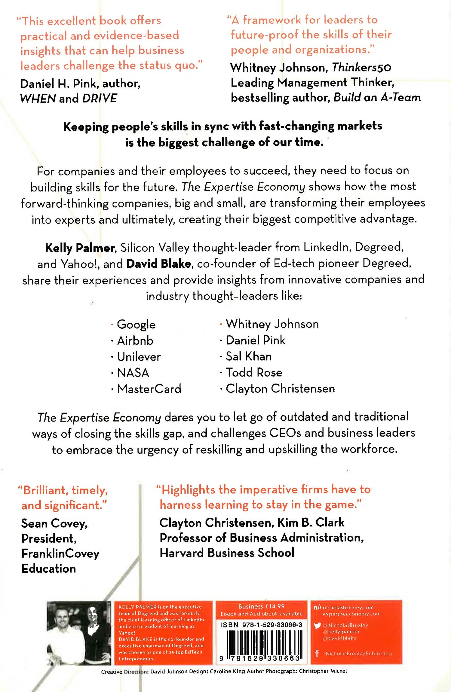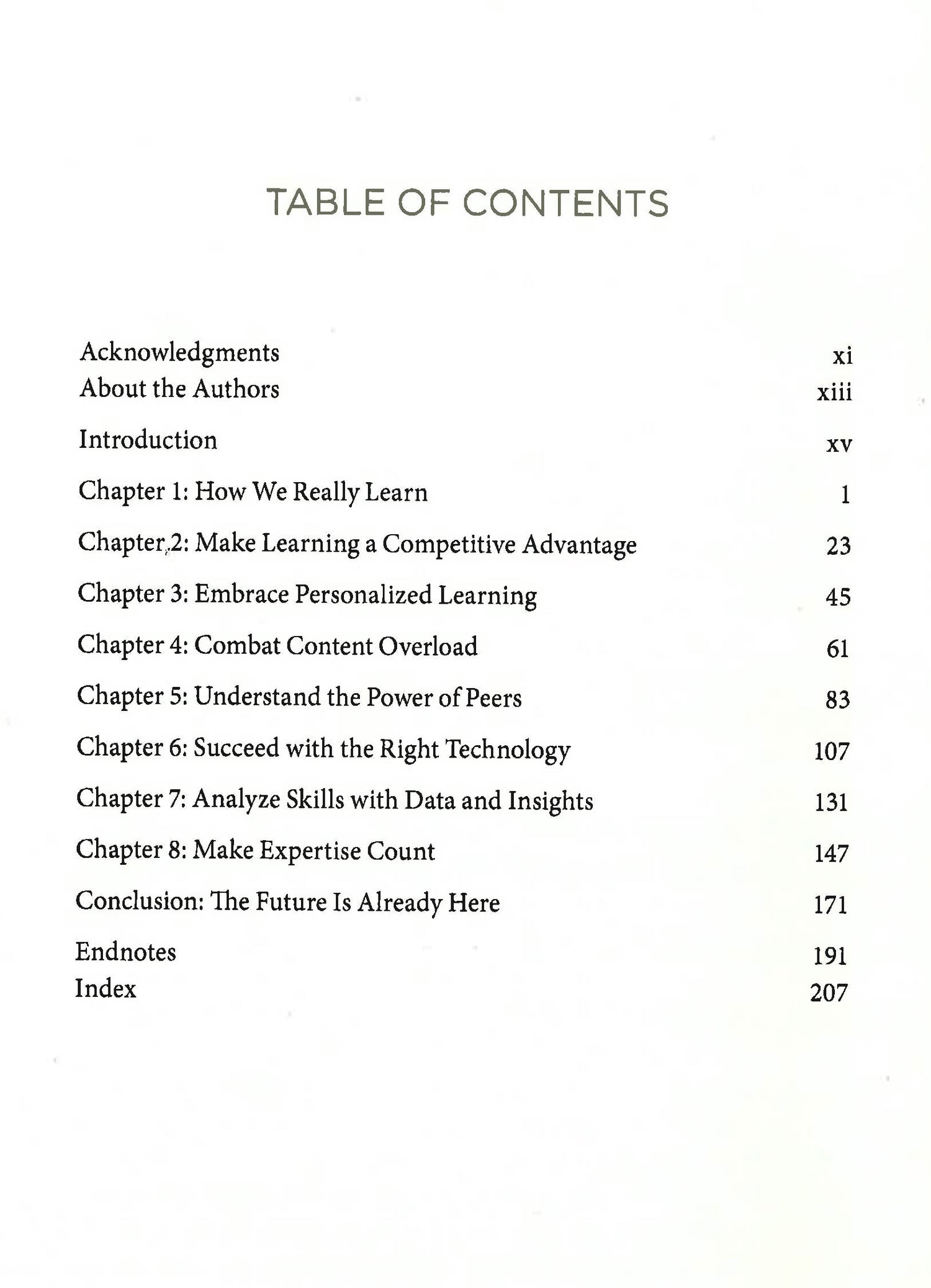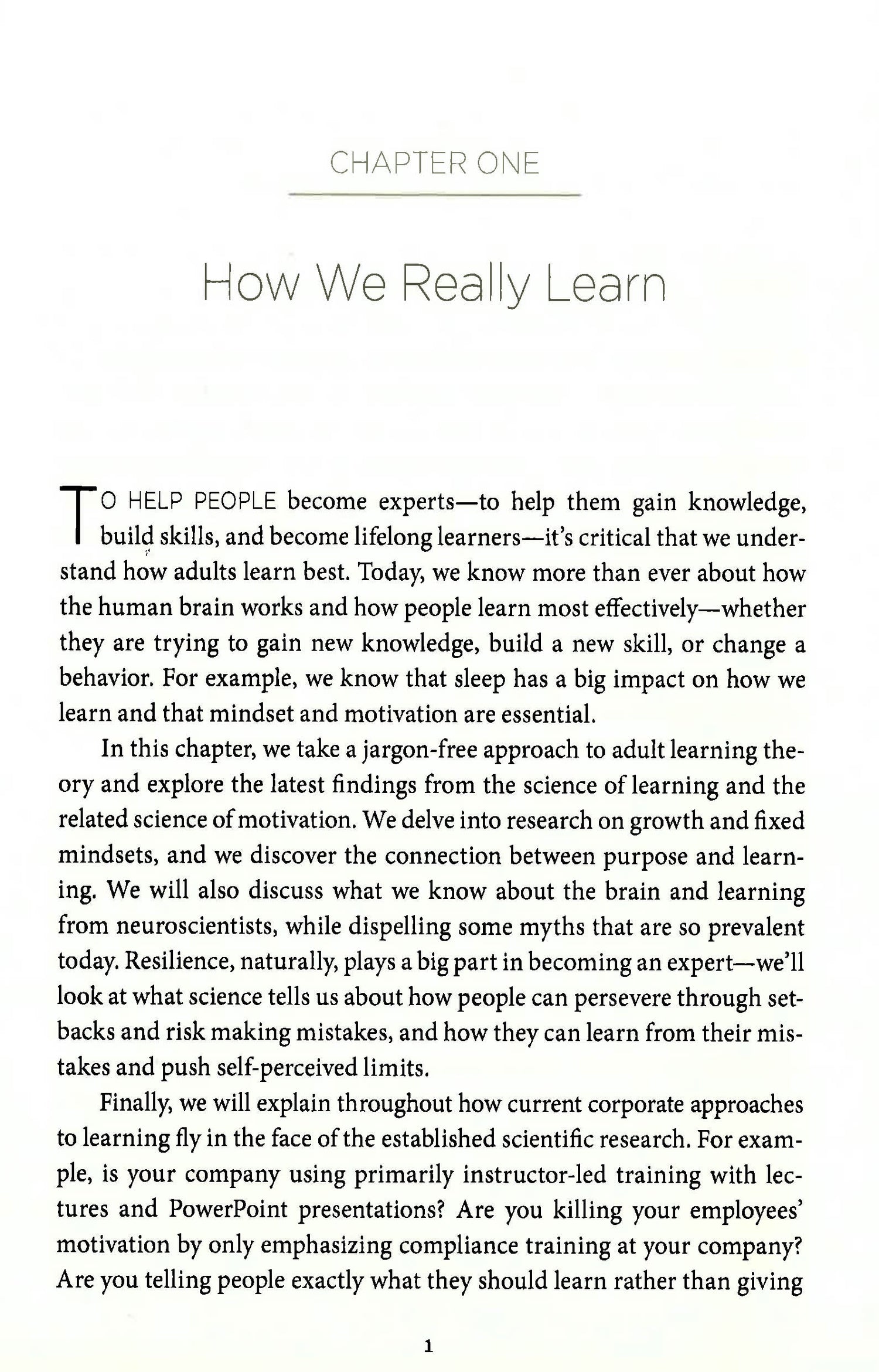 The authors provide the latest scientific research on how people really learn and concrete examples from companies in both Silicon Valley and worldwide who are driving the conversation about how to create experts and align learning innovation with business strategy. It includes interviews with people from top companies like Google, LinkedIn, Airbnb, Unilever, NASA, and MasterCard; thought leaders in learning and education like Sal Khan and Todd Rose; as well as Thinkers50 list-makers Clayton Christensen, Daniel Pink and Whitney Johnson.