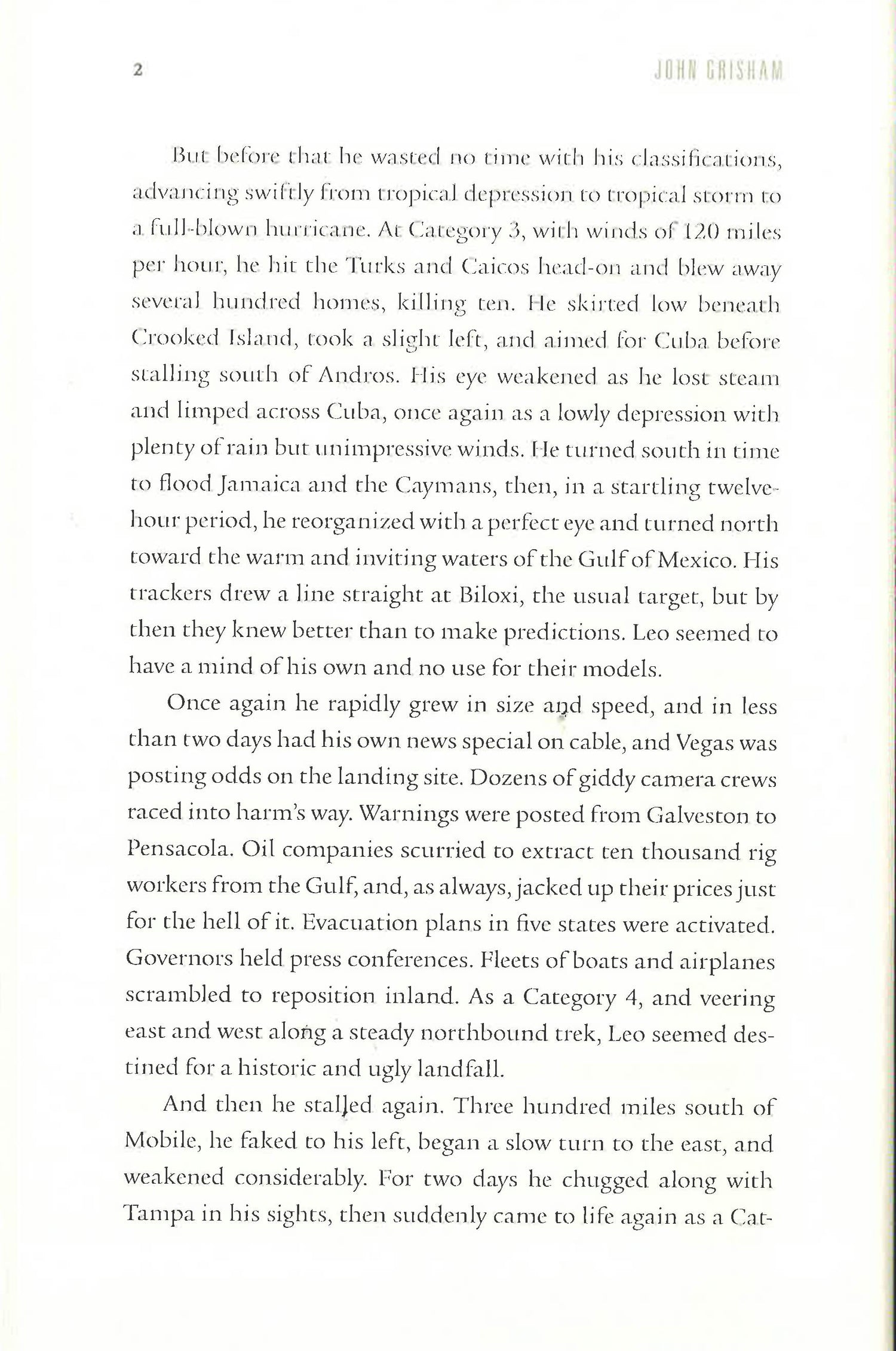 The Sunday Times bestseller from international bestseller John Grisham. Is a Perfect Storm the Perfect Time for a Murder? 'Another gem from John Grisham' Observer When Hurricane Leo threatens Florida's Camino Island, the Governor is quick to issue an evacuation order. Most residents flee but a small group of diehards decide to ride it out. Amongst them is Bruce Cable, proprietor of Bay Books in downtown Santa Rosa. The hurricane is devastating: homes and condos are levelled, hotels and storefronts ruined, streets flooded, and a dozen people are killed. One of the victims is Nelson Kerr, a friend of Bruce's who wrote timely political thrillers. But evidence suggests that the storm wasn't the cause of Nelson's death - he had received several mysterious blows to the head. Who would want Nelson dead? The local police are overwhelmed with the aftermath of the storm and in no condition to handle the case. Bruce begins to wonder if the shady characters in Nelson's novels were more fact than fiction. And somewhere on Nelson's computer is the manuscript of his new novel - could the key to the case be right there, in black and white? Bruce starts to look into it and what he finds between the lines is more shocking than any of Nelson's plot twists - and far more dangerous. Gripping, compelling and pacy, this exceptional thriller from international bestseller John Grisham is the perfect escapist read this summer. *************************************** Praise for Camino Winds: 'In American icon John Grisham's new novel, Camino Winds, an odd assortment of mystery and crime authors, some of them felons themselves, discover one of their colleagues has been murdered during the fury of a massive hurricane-the perfect crime scene' Delia Owens, author of Where the Crawdads Sing 'The Camino Island series, featuring trouble-prone bookseller Bruce Cable, is a perfect escapist mix of detective action, insider riffs on the literary world - and even a little romance' Mail on Sunday 'Camino Winds has all the usual Grisham hallmarks - a pacy plot and tension-filled scenes' Independent 'Another compelling read from Grisham, and will satisfy old fans and please new readers alike' Press Association 'The novel has enough plot twists to keep you engaged' The Herald