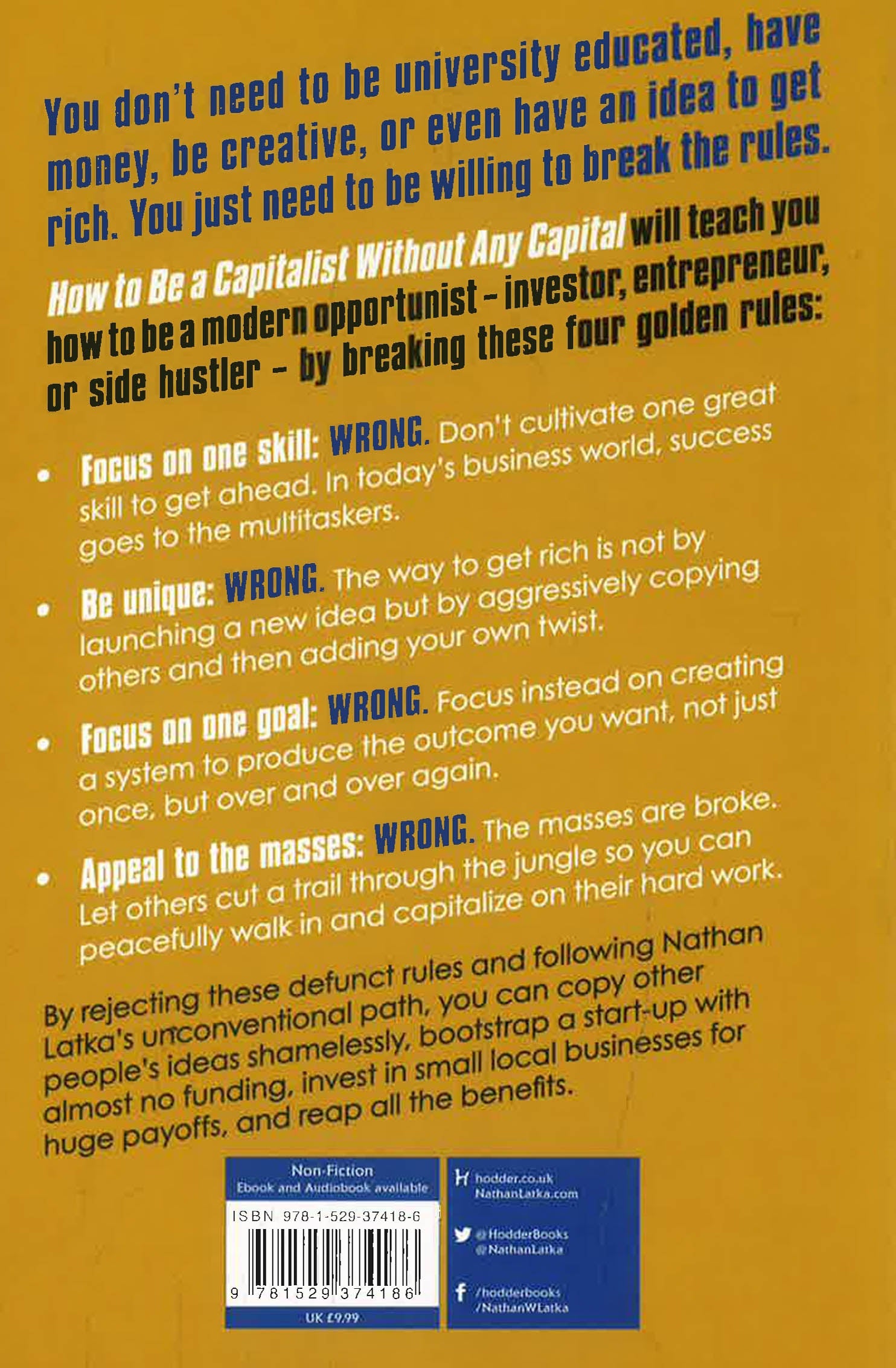 By rejecting these defunct rules and following Nathan Latka's unconventional path, you can copy other people's ideas shamelessly, bootstrap a start-up with almost no funding, invest in small local businesses for huge payoffs, and reap all the benefits.