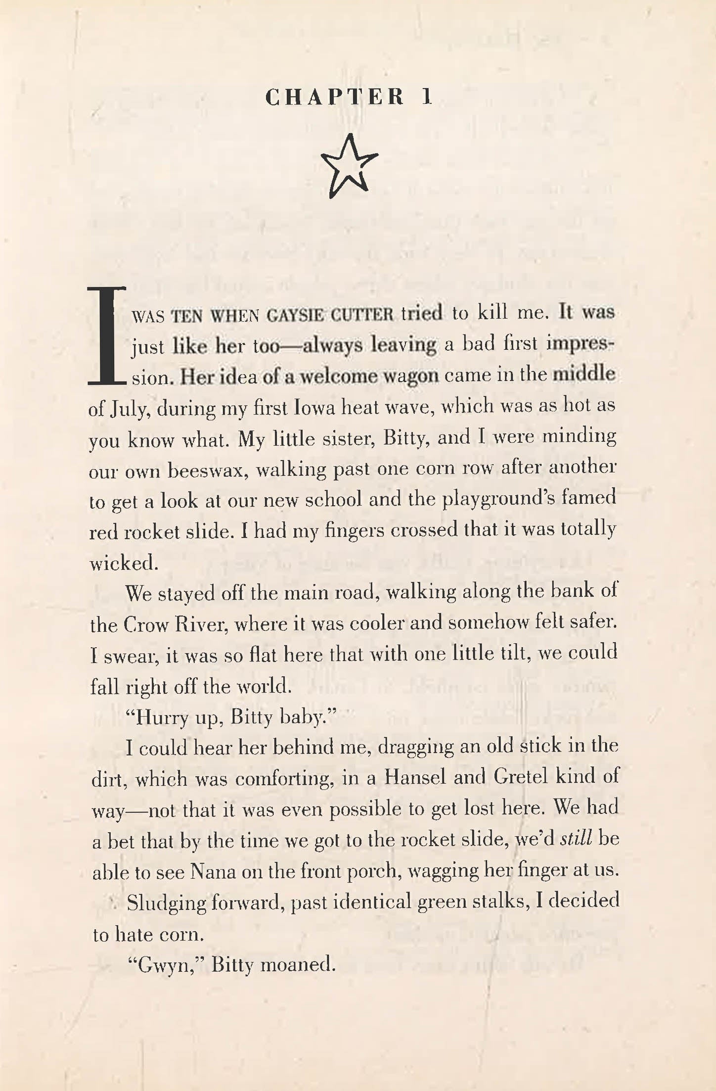 But Gwyn isn't in Crow, Iowa, just for royal cows. Her family has moved there, where her parents grew up, in the hopes of jogging her mother Vienna's memory. Vienna can no longer remember anything past the age of thirteen, not even that she has two young daughters. Gwyn's father is obsessed with finding out everything he can to help his wife, but Gwyn's focused on problems that seem a little more within her reach. Like proving that the very strange Gaysie Cutter who lives next door is behind the disappearance of her only friend, Wilbur Truesdale.
