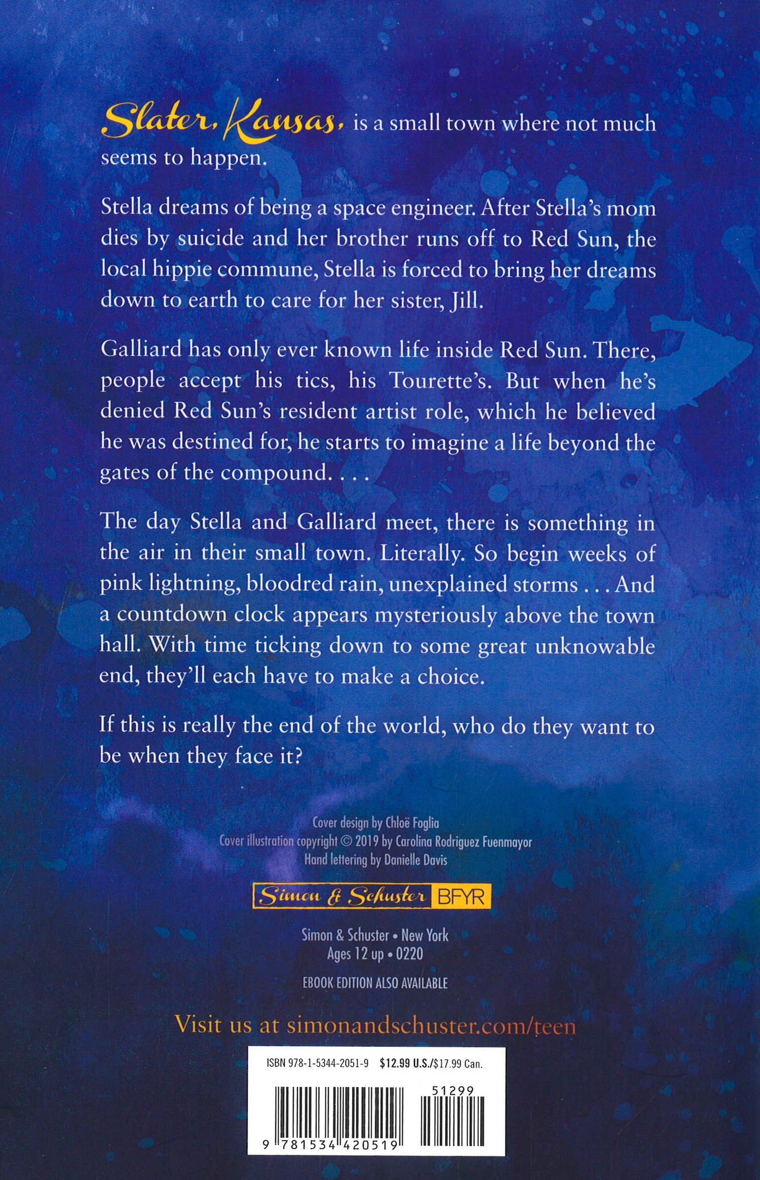The day Stella and Galliard meet, there is something in the air in their small town. Literally. So begin weeks of pink lightning, blood red rain, unexplained storms...And a countdown clock appears mysteriously above the town hall. With time ticking down to some great unknowable end they'll each have to make a choice.