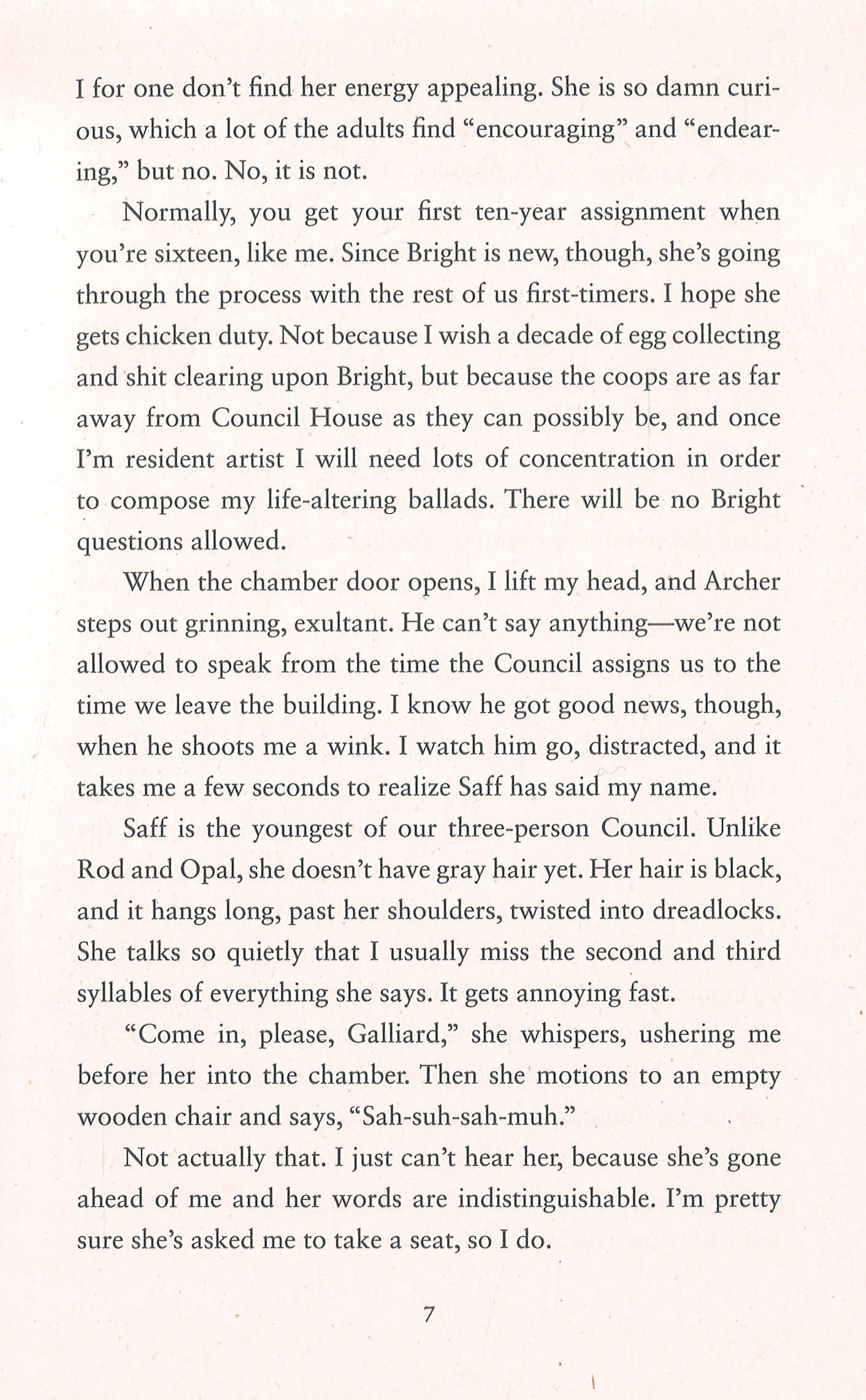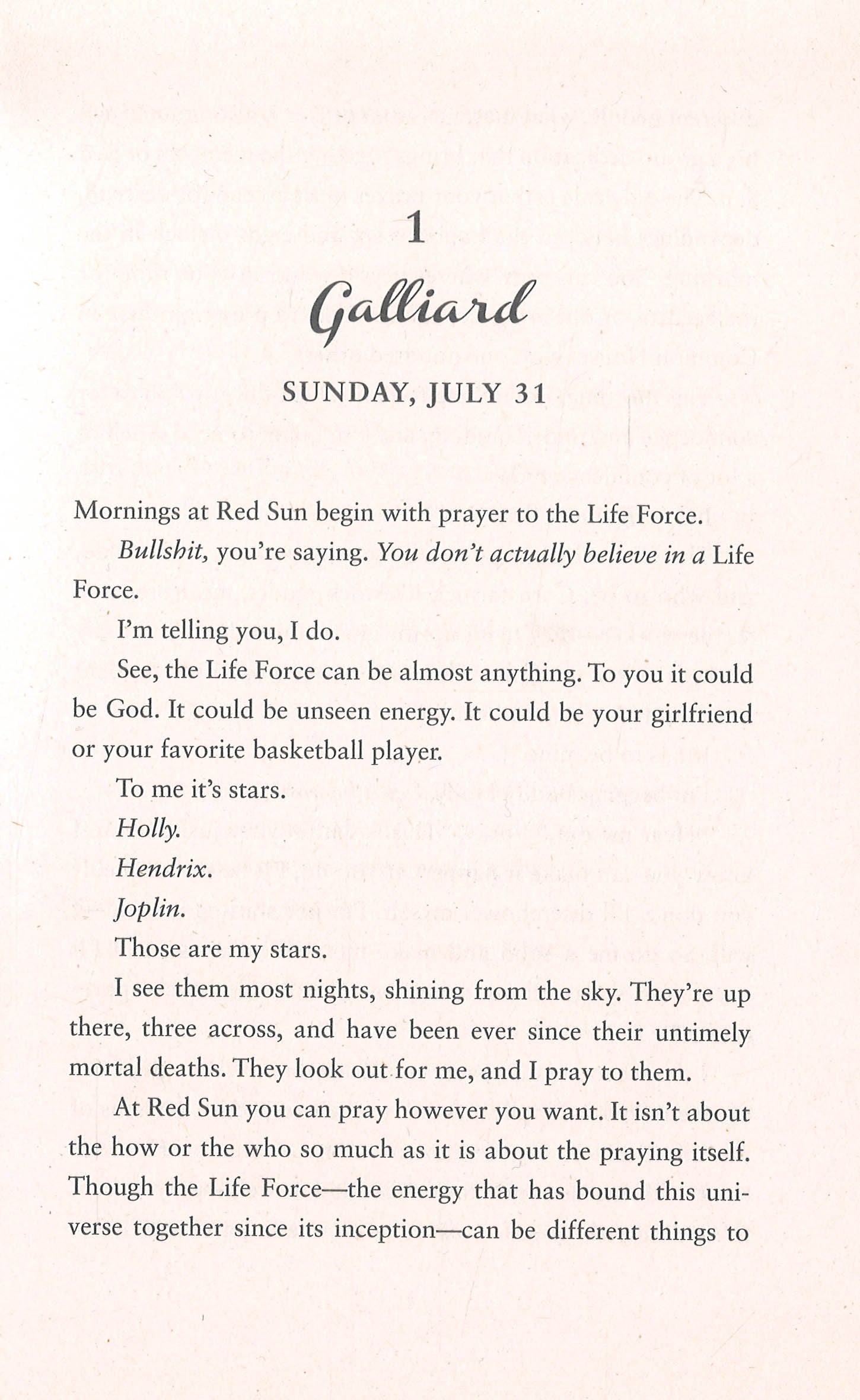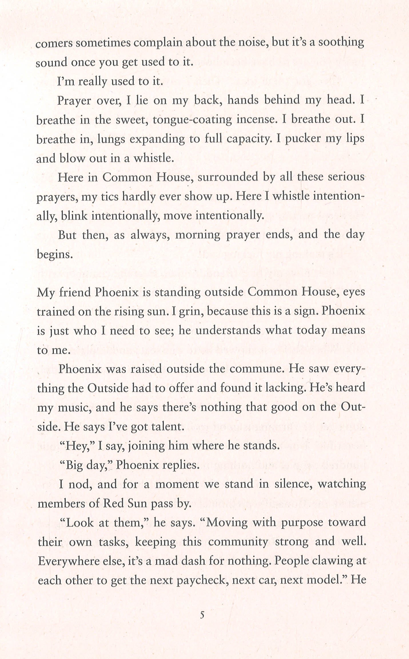 Galliard has only ever known life inside Red Sun. There, people accept his tics, his Tourette's. But when he's denied Red Sun's resident artist role, which he'd believed he was destined for, he starts to imagine a life beyond the gates of the compound...