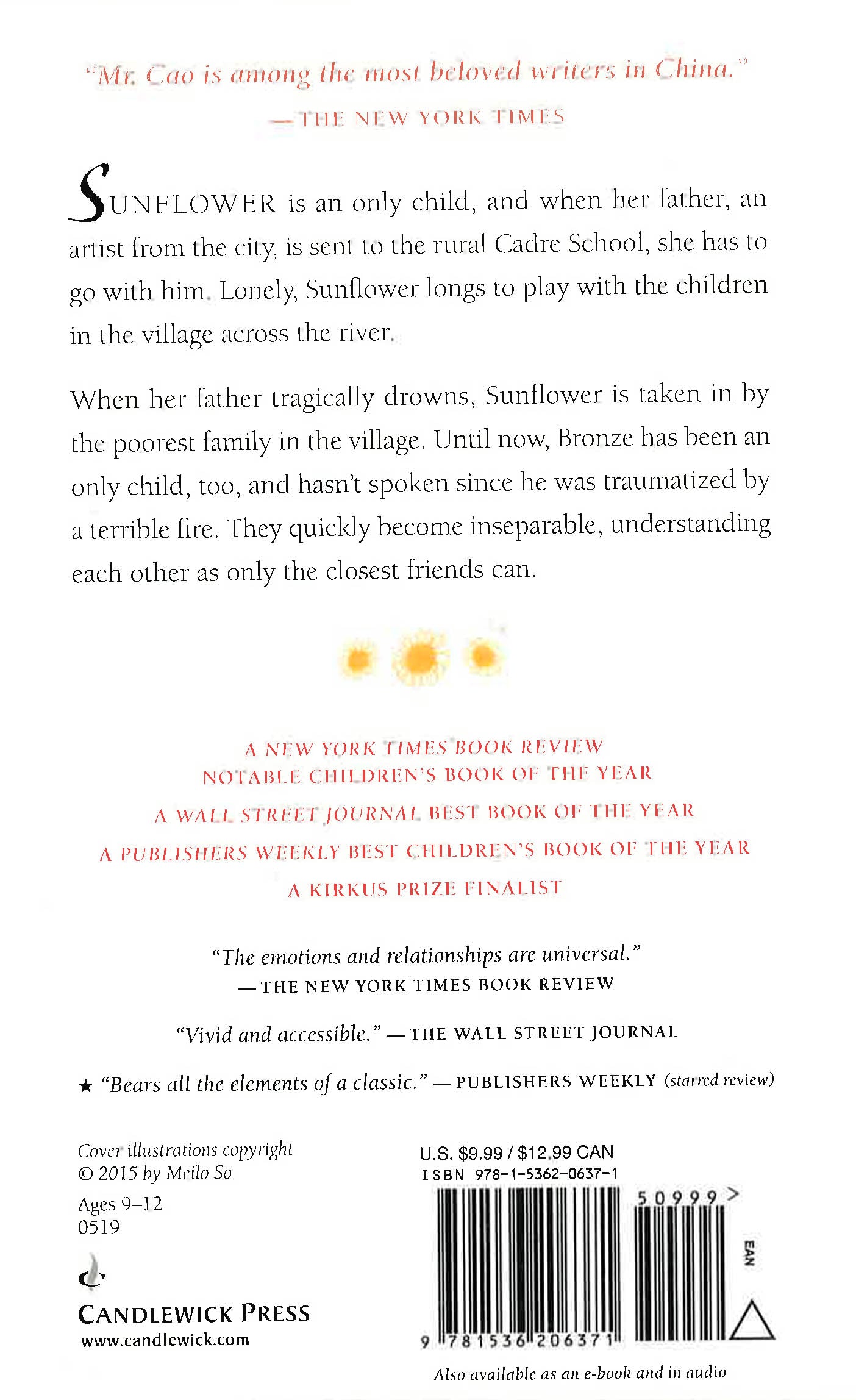 Sunflower is an only child, and when her father is sent to the rural Cadre School, she has to go with him. Her father is an established artist from the city and finds his new life of physical labor and endless meetings exhausting. Sunflower is lonely and longs to play with the local children in the village across the river. When her father tragically drowns, Sunflower is taken in by the poorest family in the village, a family with a son named Bronze. Until Sunflower joins his family, Bronze was an only child, too, and hasn’t spoken a word since he was traumatized by a terrible fire. Bronze and Sunflower become inseparable, understanding each other as only the closest friends can. Translated from Mandarin, the story meanders gracefully through the challenges that face the family, creating a timeless story of the trials of poverty and the power of love and loyalty to overcome hardship.