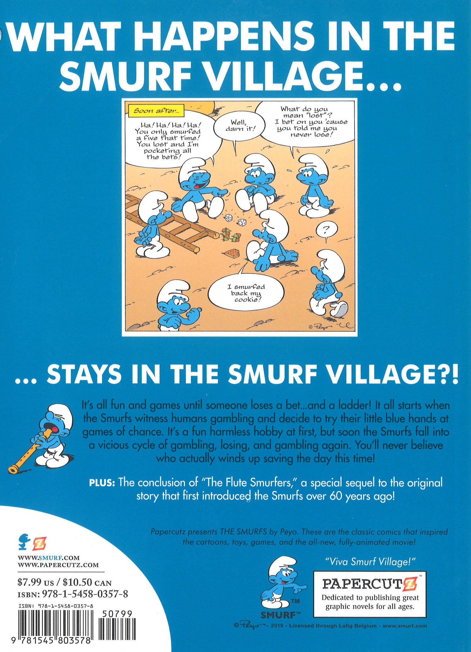 The Smurfs have a gambling problem! Celebrating over 60 years of SMURFS, Papercutz is all in continuing its long winning streak of SMURFS graphic novels. With an all-new animated TV series in the works, Papercutz continues to double-down and publish THE SMURFS comics that started it all. Here in "The Gambling Smurfs" we see the consequences of what happens after the Smurfs visit the Human world and are inspired to try their little blue hands at games of chance. It starts as just a fun new hobby, but when the stakes are raised, the Smurfs fall into a vicious cycle of playing, betting, and losing, and playing again. Has the Smurfs Village become the new Sin City? It's no big surprise that Gargamel is also around to take advantage of this unfortunate situation. Has Gargamel's luck finally changed? Have the Smurfs finally lost?