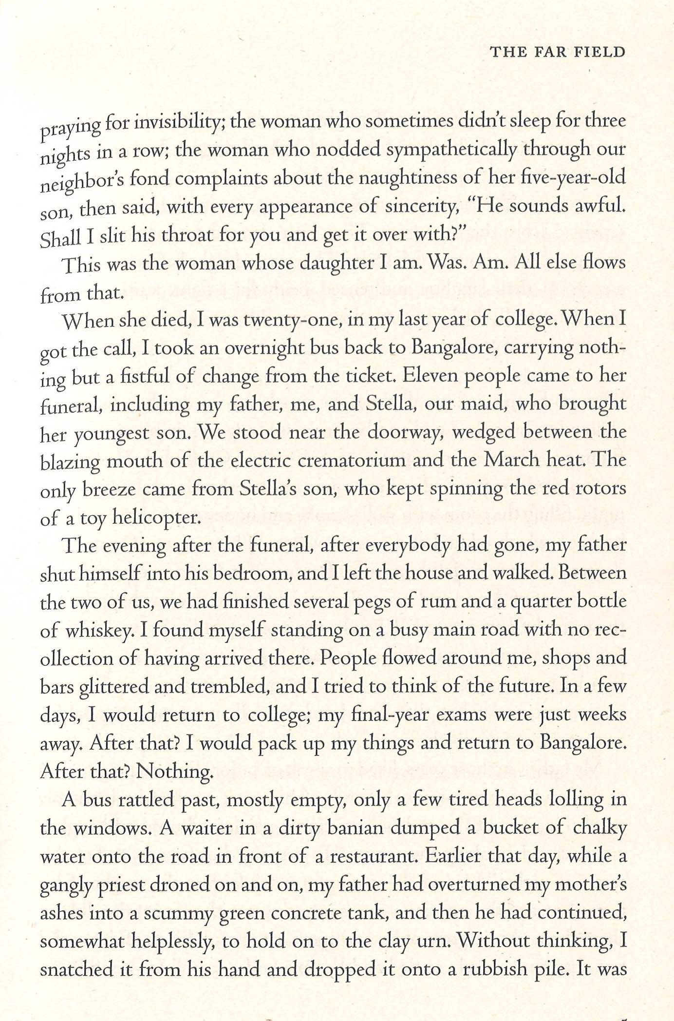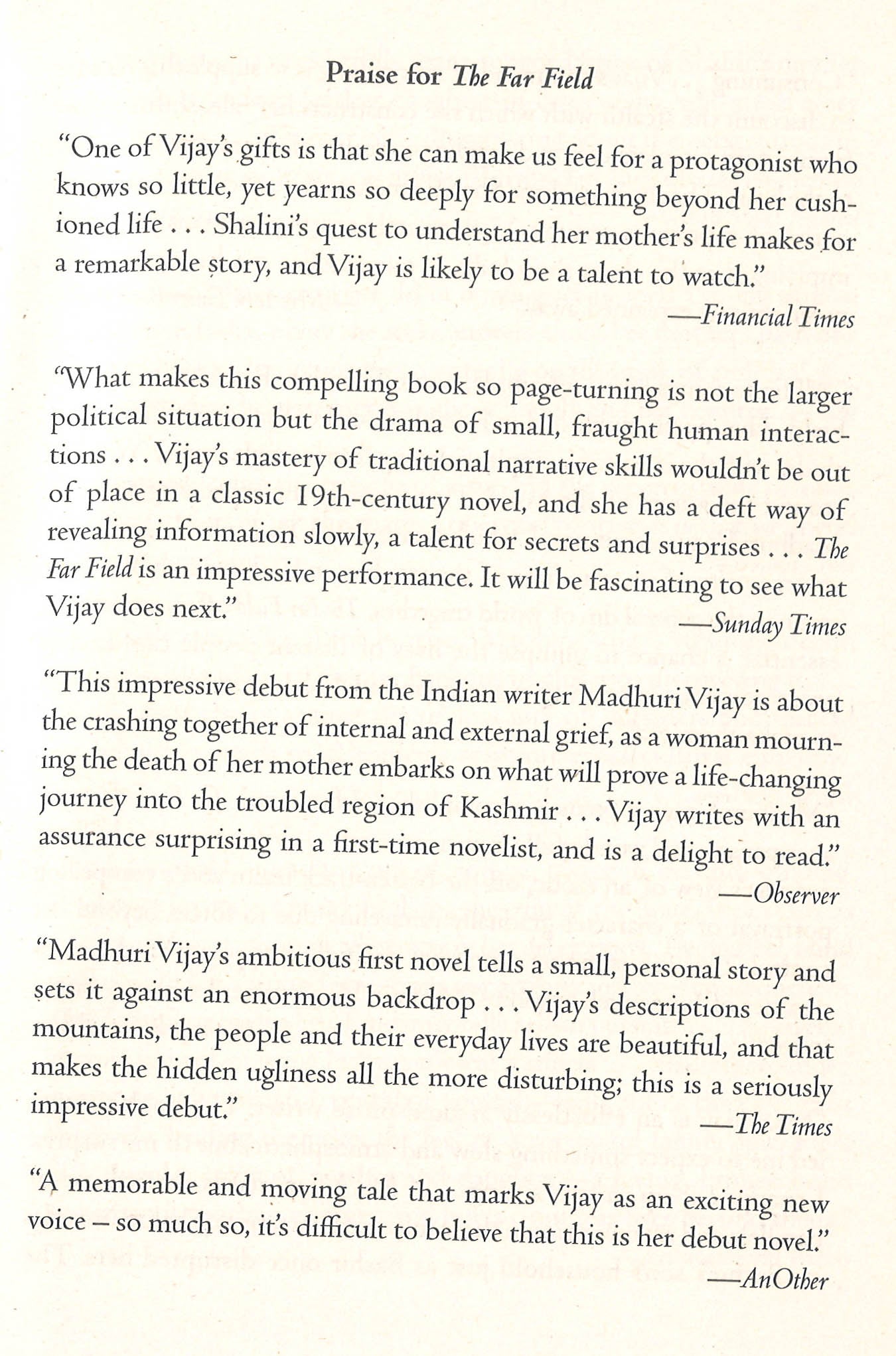 With rare acumen and evocative prose, in The Far Field Madhuri Vijay masterfully examines Indian politics, class prejudice, and sexuality through the lens of an outsider, offering a profound meditation on grief, guilt and the limits of compassion.