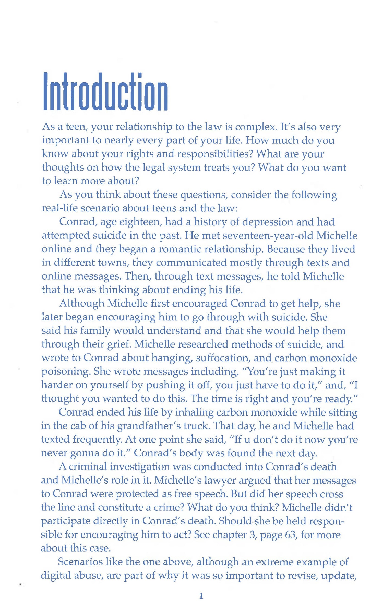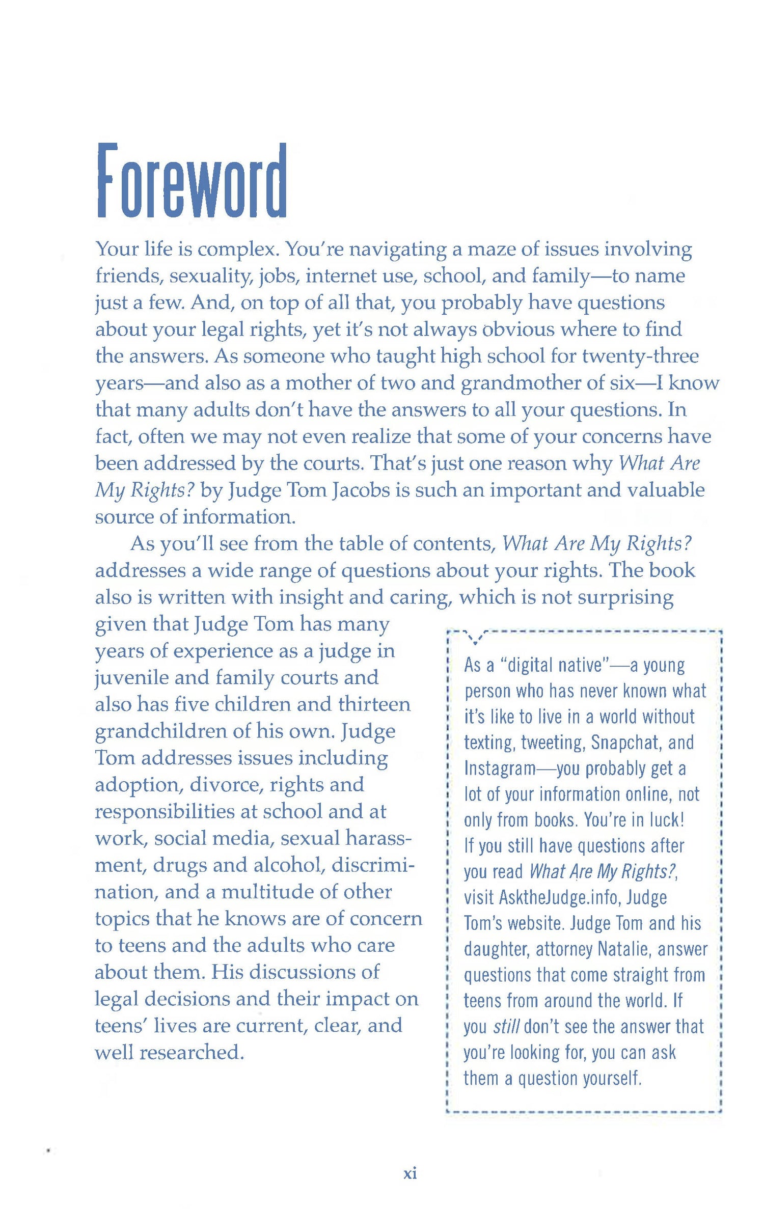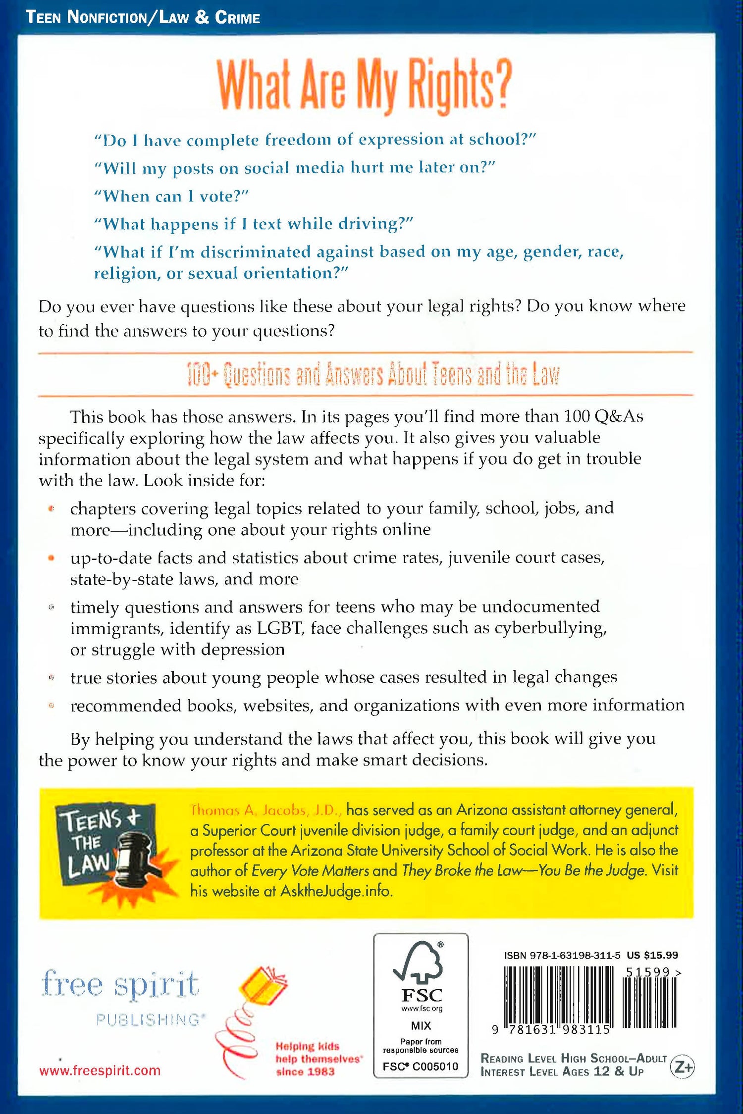 Accessible, straightforward answers to more than 100 questions about teens legal rights and responsibilities. Can I be prosecuted for comments I make online? What are my rights as an undocumented teen? When can I get a tattoo? These questions and many more are asked and answered in What Are My Rights? Teens often have questions about the justice system but don t always know where to turn for answers. This book provides those answers, exploring more than 100 legal questions pertaining specifically to teens. This revised and updated fourth edition includes fresh facts, updated statistics, and brand-new questions and answers. Using a straightforward tone and drawing on examples from real-life juvenile court cases, Judge Tom Jacobs helps readers learn about the laws that affect them, appreciate their legal rights, and consider their responsibilities.Teens & the Law Series The Teens & the Law series familiarizes young readers with our legal system, dispels myths and mysteries, and shows that the law is by and for the people including teens. The books cover numerous important legal issues pertaining to young people, such as the rights of minors; the rights to privacy and freedom of expression; the rights of gay and lesbian students; the rights of students with disabilities; the rights of parents, schools, and workplaces; the voting and political system; abortion; living wills; traffic laws; curfews; probation; and juvenile versus adult court. Crimes discussed include forgery, obscene conduct, defamation, vandalism, gang-related crimes, gambling, theft, underage drinking, drug and weapon possession, hacking, cyberbullying, sexual harassment, rape, hate crimes, arson, threats, and violence. Each book offers discussion points, tips and advice, detailed resources, emergency hotlines, and probing questions for further reflection.