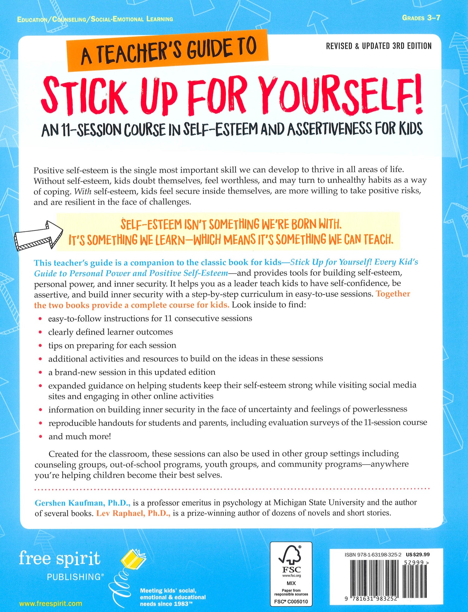 This teacher s companion to a classic book for kids provides tools for building self-esteem and personal power. Without self-esteem, kids doubt themselves and may turn to unhealthy habits as a way of coping. With self-esteem, kids feel secure, are willing to take positive risks, and are resilient in the face of challenges. This teacher s guide expands the messages of Stick Up for Yourself!, teaching self-confidence and how to be assertive with easy-to-use sessions. Created for the classroom, these sessions can also be used in other group settings including counseling groups, out-of-school programs, community programs, and more. Digital content includes reproducible handouts.