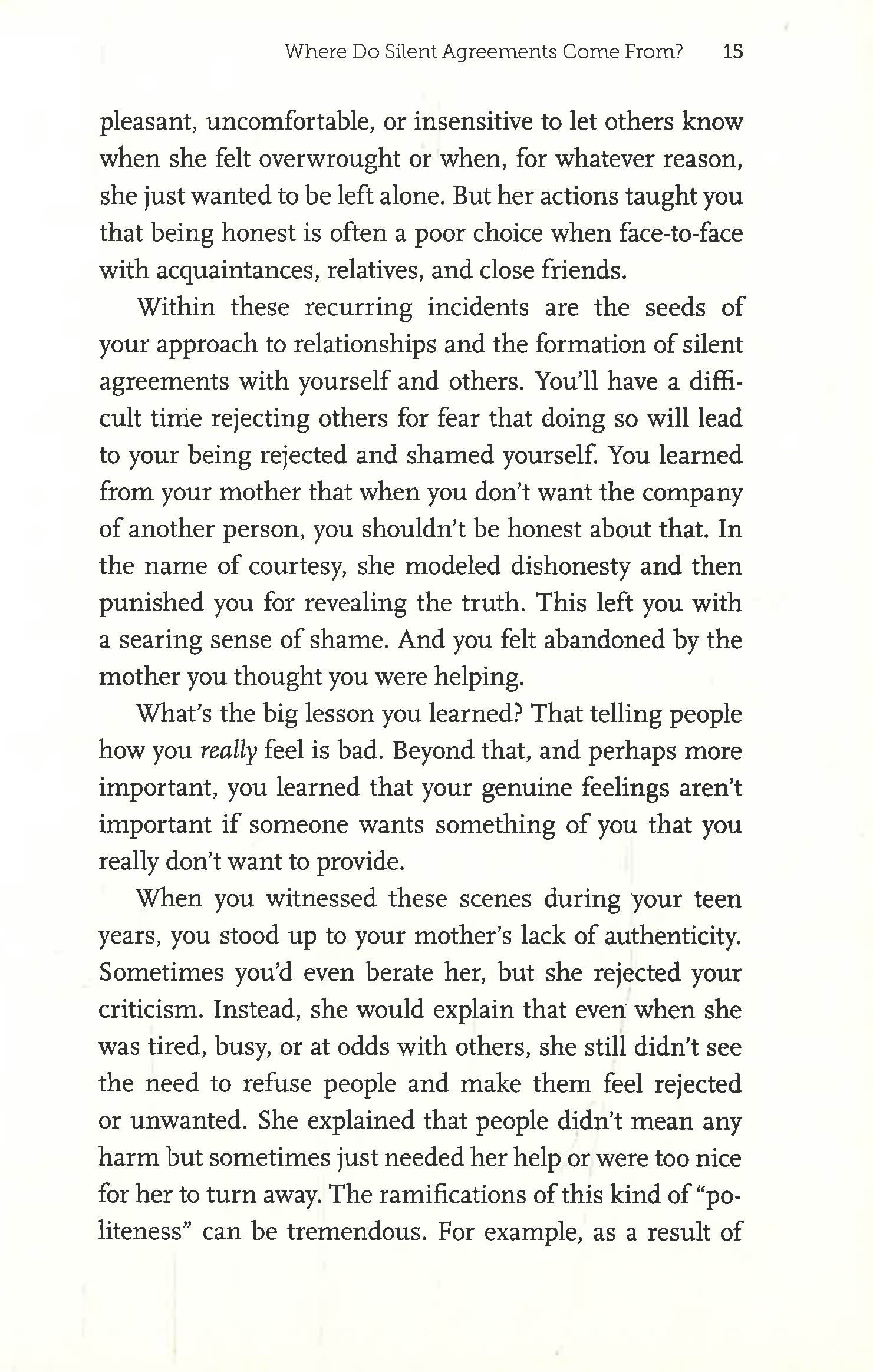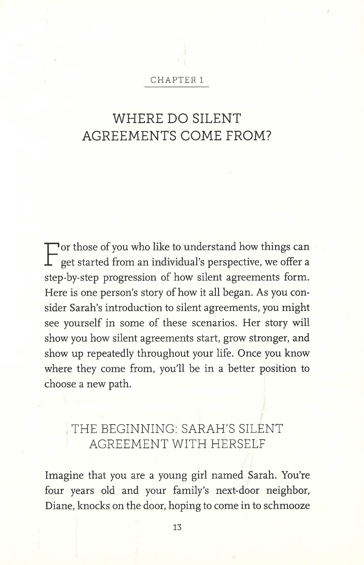 If you have relationships, you've likely been part of silent agreements. Silent agreements are the implicit "rules" of your relationships that arise from unspoken beliefs and expectations that both parties hold, stemming from your earliest experiences and reinforced as you mature. They can sound something like "The person who makes more money should pay for the dates," or "My boss doesn't offer me a raise, and he knows I won't ask for one." These agreements can hinder your relationships, remaining undiscussed due to fear, aversion to conflict, feelings of obligation, or guilt. Because expectations so rarely line up and neither person will address the issue, a silent agreement can cause unhappiness and resentment on both sides.