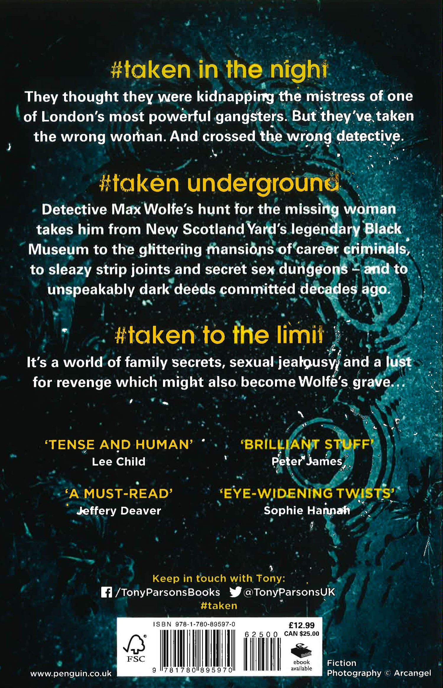 Tense and human' LEE CHILD 'Brilliant stuff' PETER JAMES'A must-read' JEFFERY DEAVER_____________________#taken in the nightThey thought they were kidnapping the mistress of one of London's most powerful gangsters. But they've taken the wrong woman. And crossed the wrong detective.#taken undergroundDetective Max Wolfe's hunt for the missing woman takes him from New Scotland Yard's legendary Black Museum to the glittering mansions of career criminals, from sleazy strip joints to secret sex dungeons - and to unspeakably dark deeds committed decades ago.#taken to the limitIt's a world of family secrets, sexual jealousy, and a lust for revenge - which might also become Wolfe's grave..._____________________'Eye-widening twists' SOPHIE HANNAH'Whip-fast, twisting like a moped in a traffic jam.' THE SUN'Pages that stick to the fingers' SHOTS MAGAZINE'Fast-paced, twisty ... will have you hooked from start to end.' CULTUREFLY