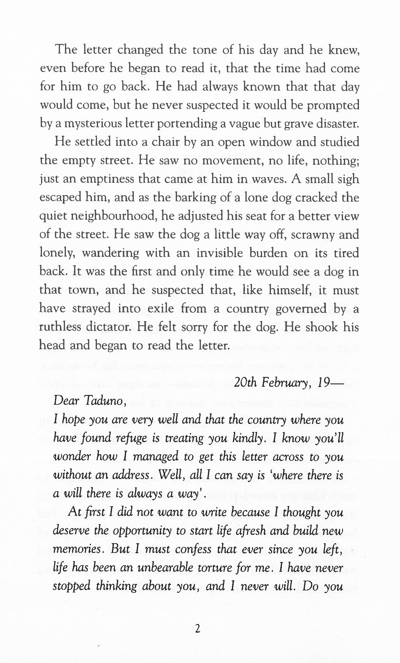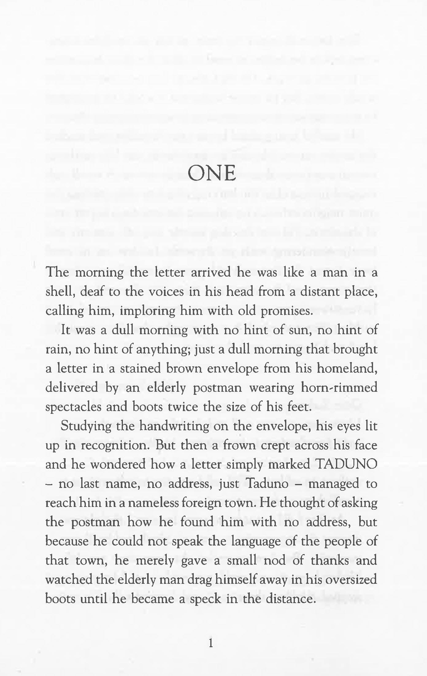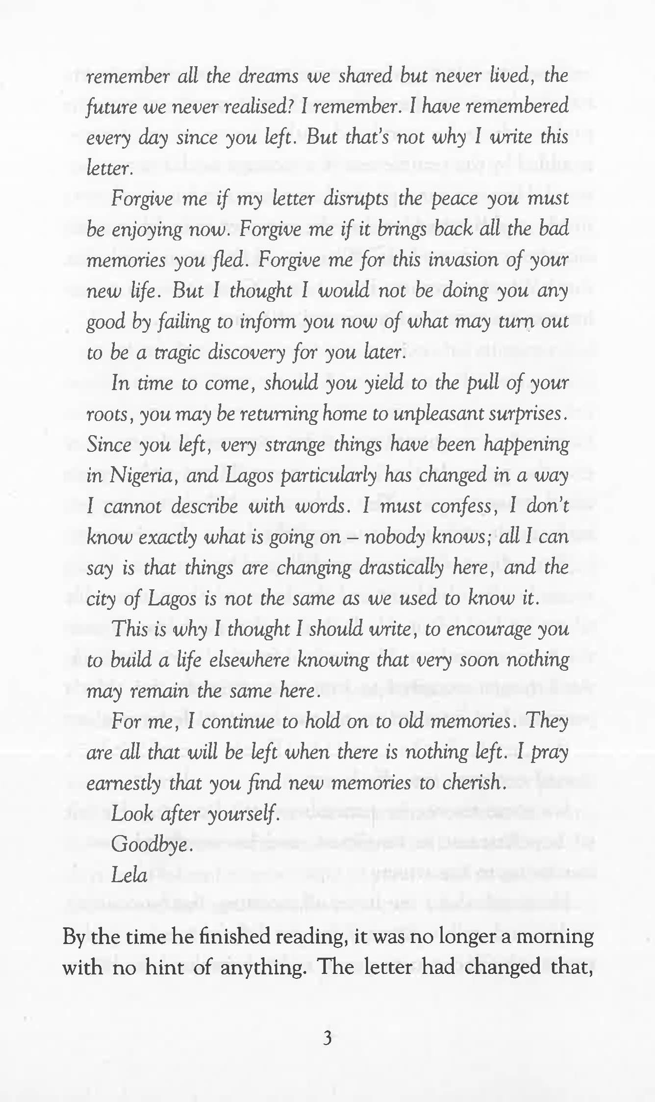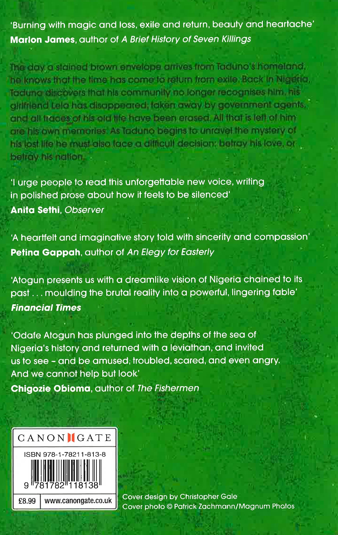 The day a stained brown envelope arrives from Taduno's homeland, he knows that the time has come to return from exile. Back in Nigeria, Taduno discovers that his community no longer recognises him, his girlfriend Lela has disappeared, taken away by government agents, and all traces of his old life have been erased. All that is left of him are his own memories. As Taduno begins to unravel the mystery of his lost life he must also face a difficult decision: betray his love, or betray his nation.
