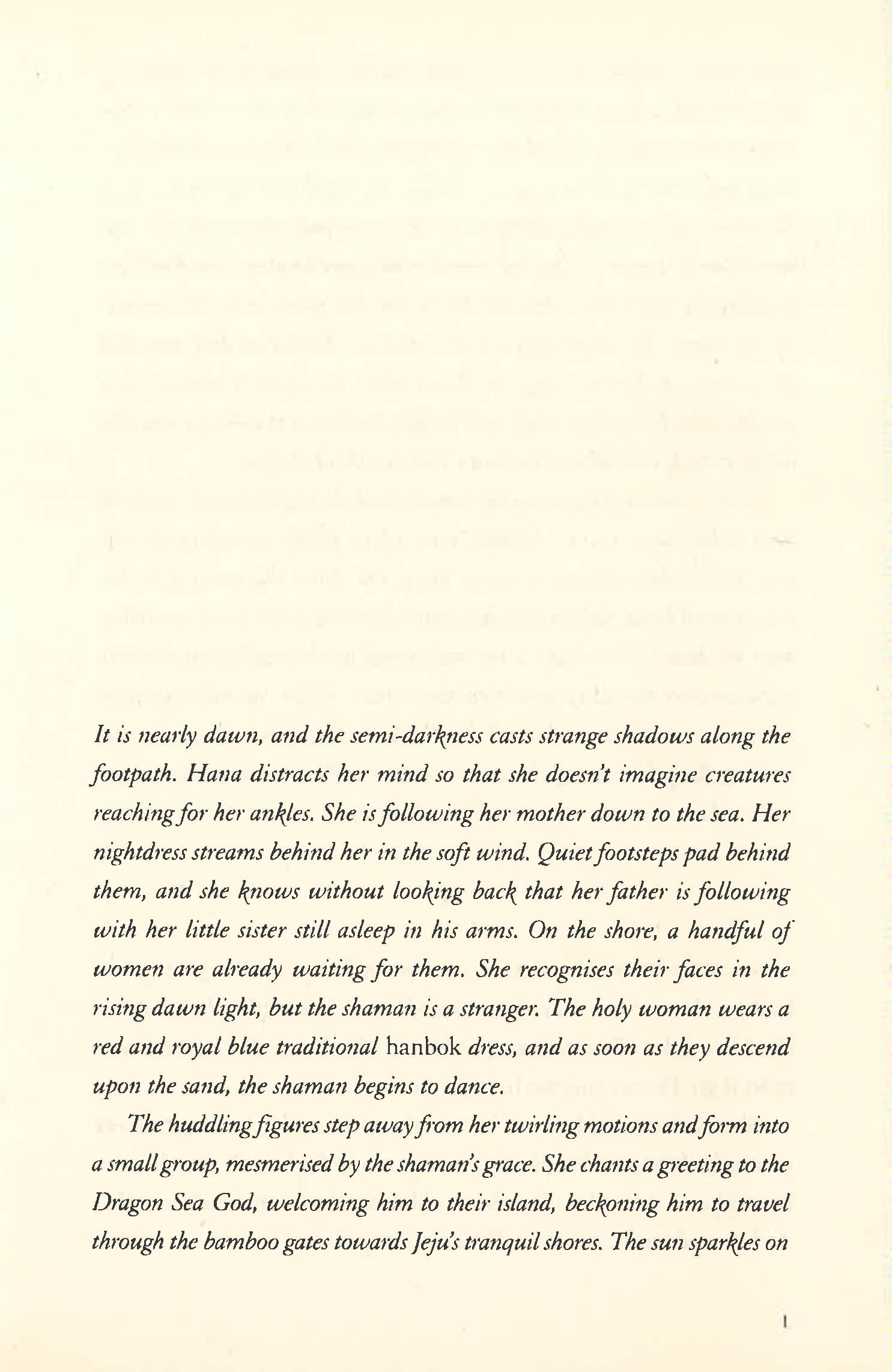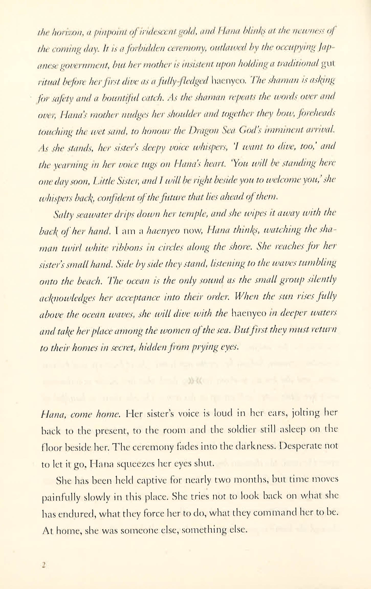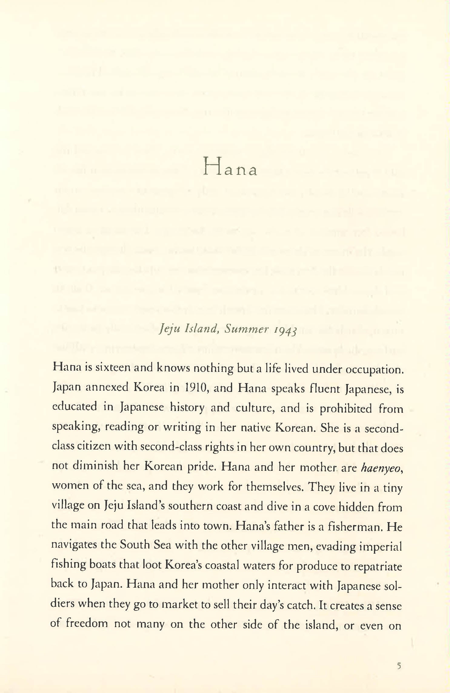 One day Hana sees a Japanese soldier heading for where Emi is guarding the day's catch on the beach. Her mother has told her again and again never to be caught alone with one. Terrified for her sister, Hana swims as hard as she can for the shore.