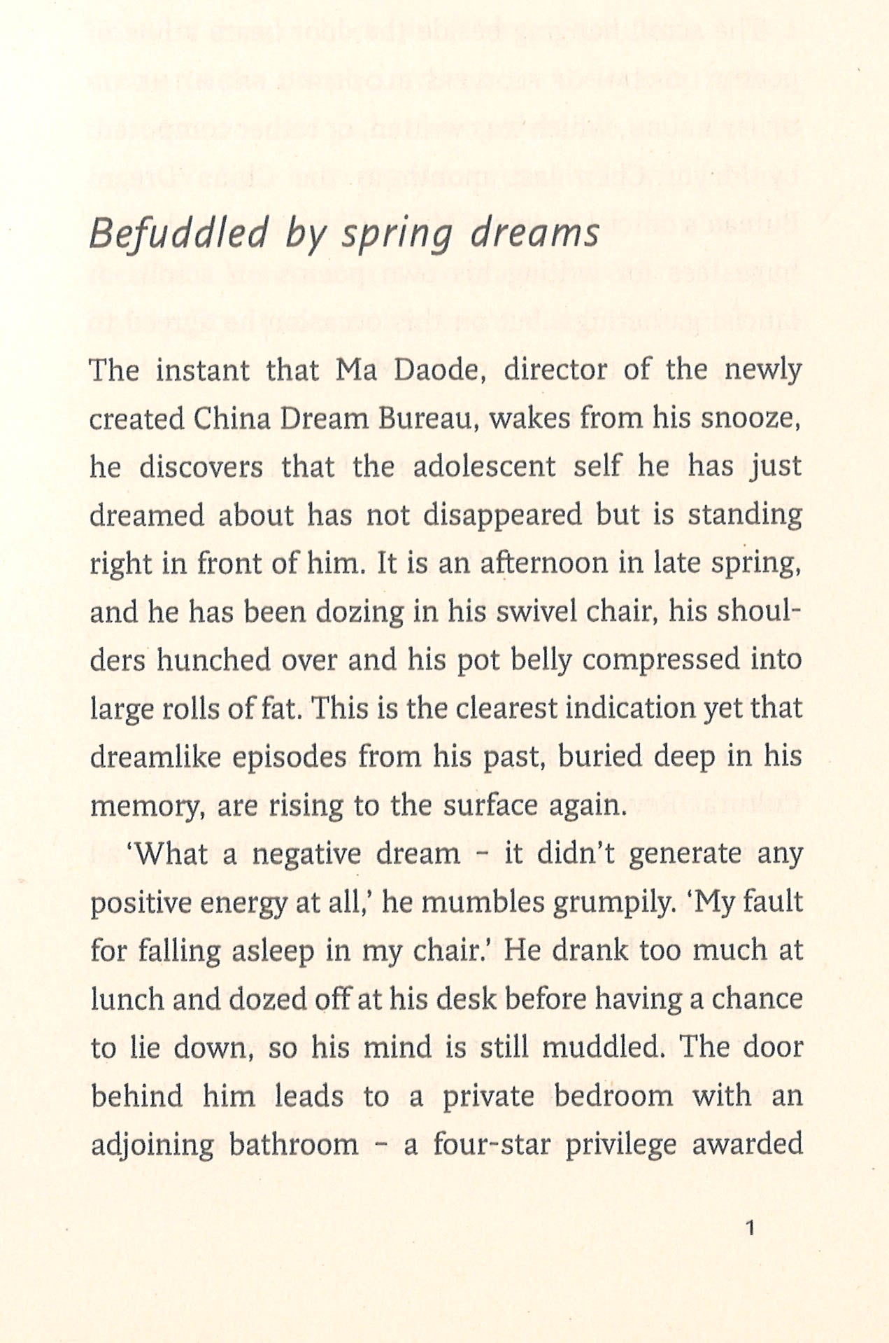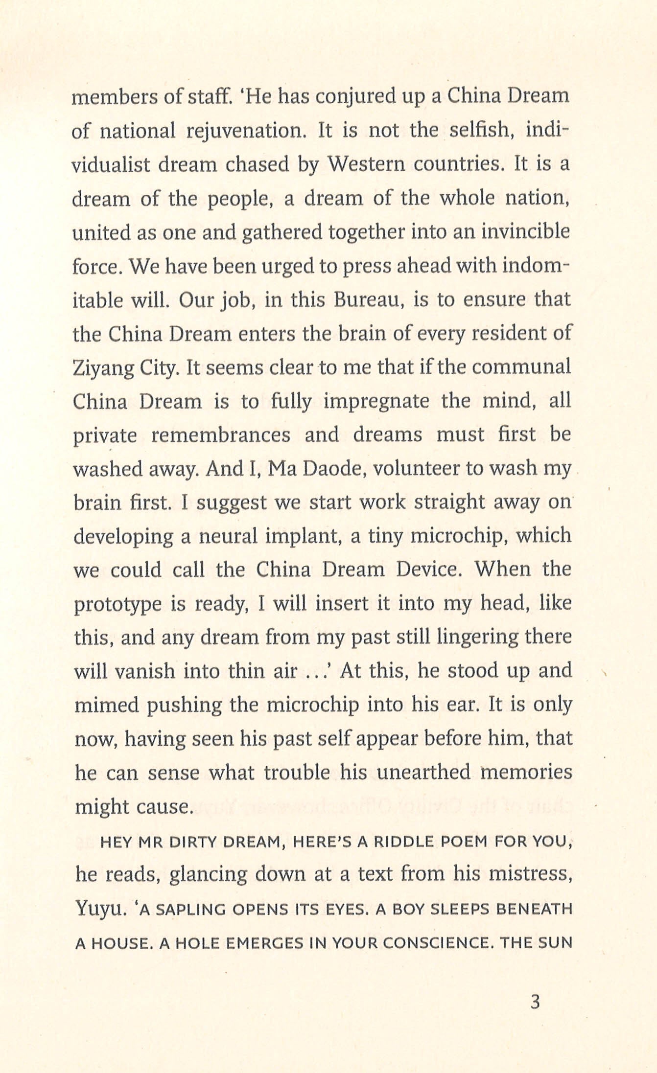 Blending fact with fiction, China Dream is an unflinching satire of totalitarianism. After decades of loyal service, Ma Daode, a corrupt and lecherous party official, has been appointed director of the China Dream Bureau, charged with promoting President Xi Jinping's China Dream of national rejuvenation. But just as he is about to present his plan for a microchip that will be implanted into the brain of every citizen to replace all painful recollections with a collective dream of national supremacy, his sanity begins to unravel. Plagued by flashbacks of the Cultural Revolution, his nightmare visions from the past threaten to destroy his dream of a glorious future.