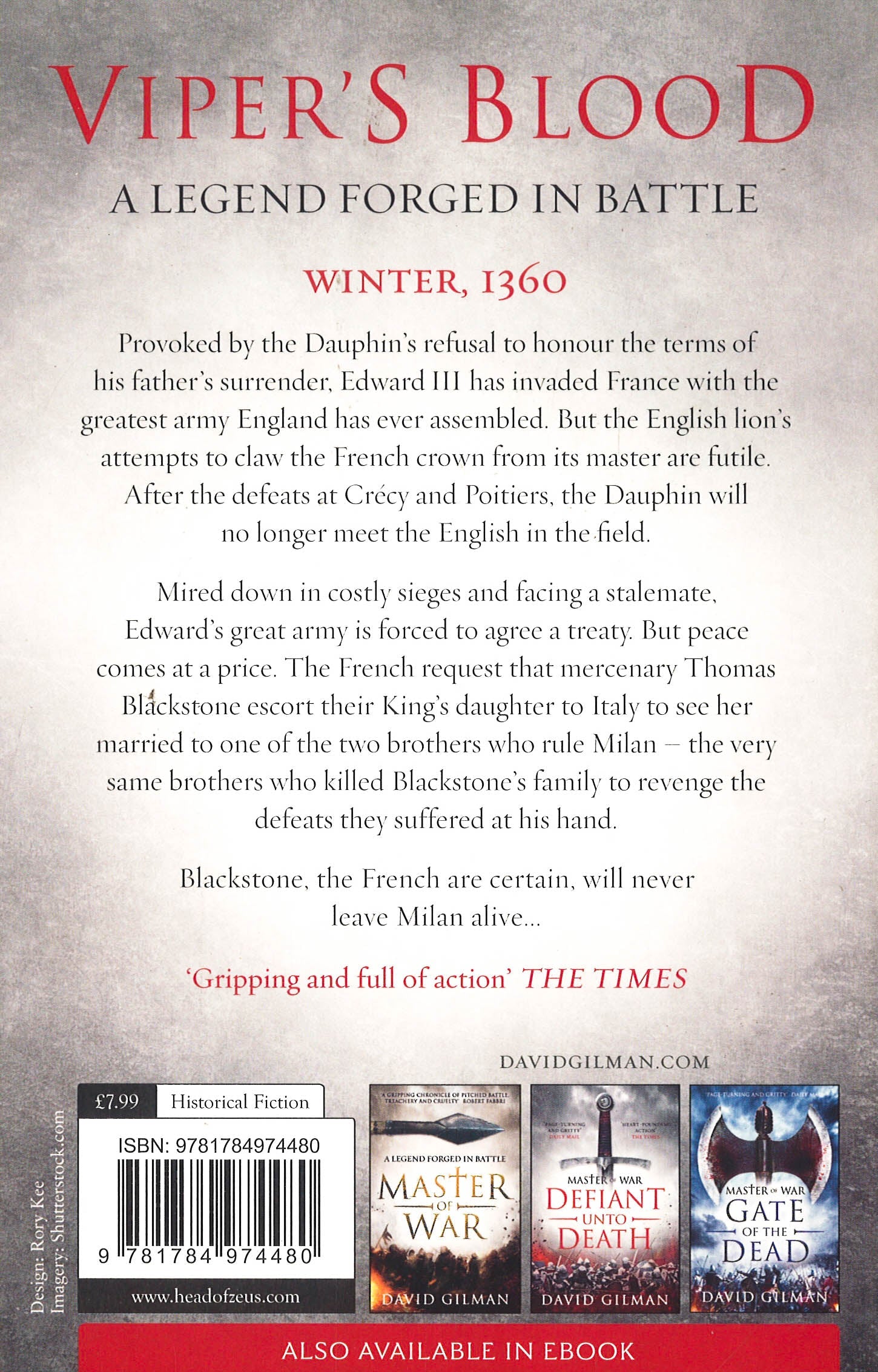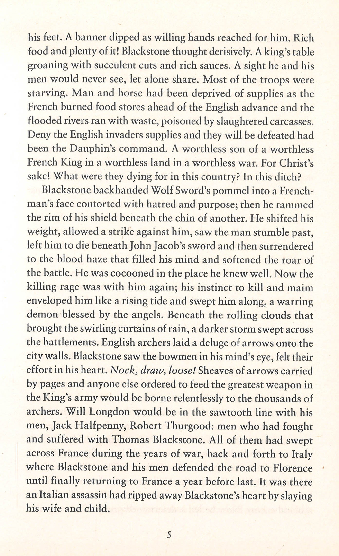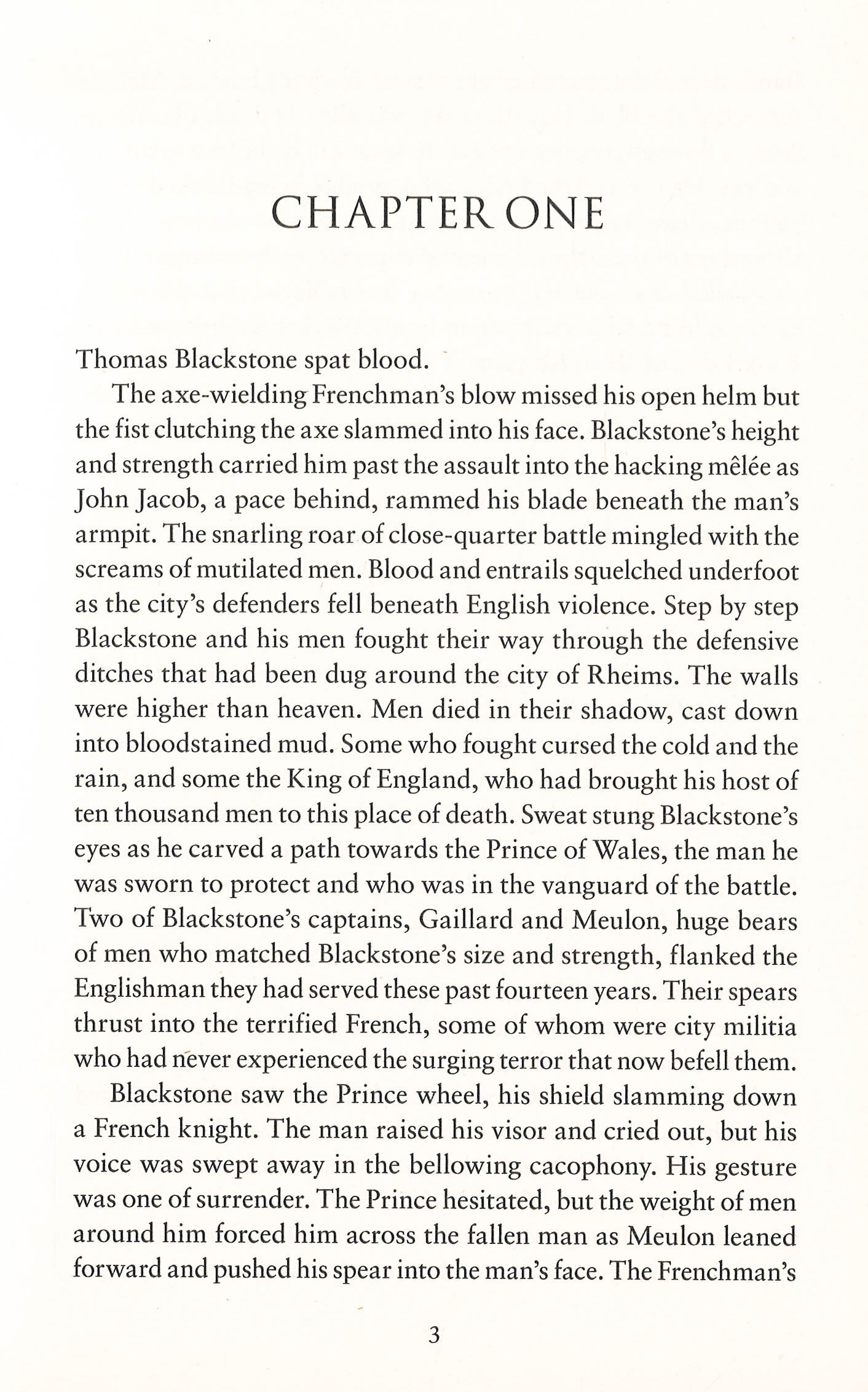 Mired down in costly sieges and facing a stalemate, Edward's great army is forced to argee a treaty. But peace comes at a price. The French request that Blackstone escort their King's daughter to Italy to see her married to one of the two brothers who rule Milan – the same brothers who killed Blackstone's family to revenge the defeats they suffered at his hand.