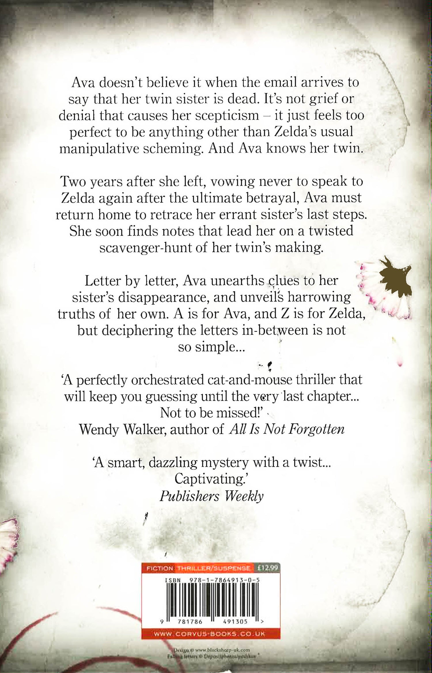 Letter by letter, Ava unearths clues to her sister's disappearance: and unveils harrowing truths of her own. A is for Ava, and Z is for Zelda, but deciphering the letters in-between is not so simple...