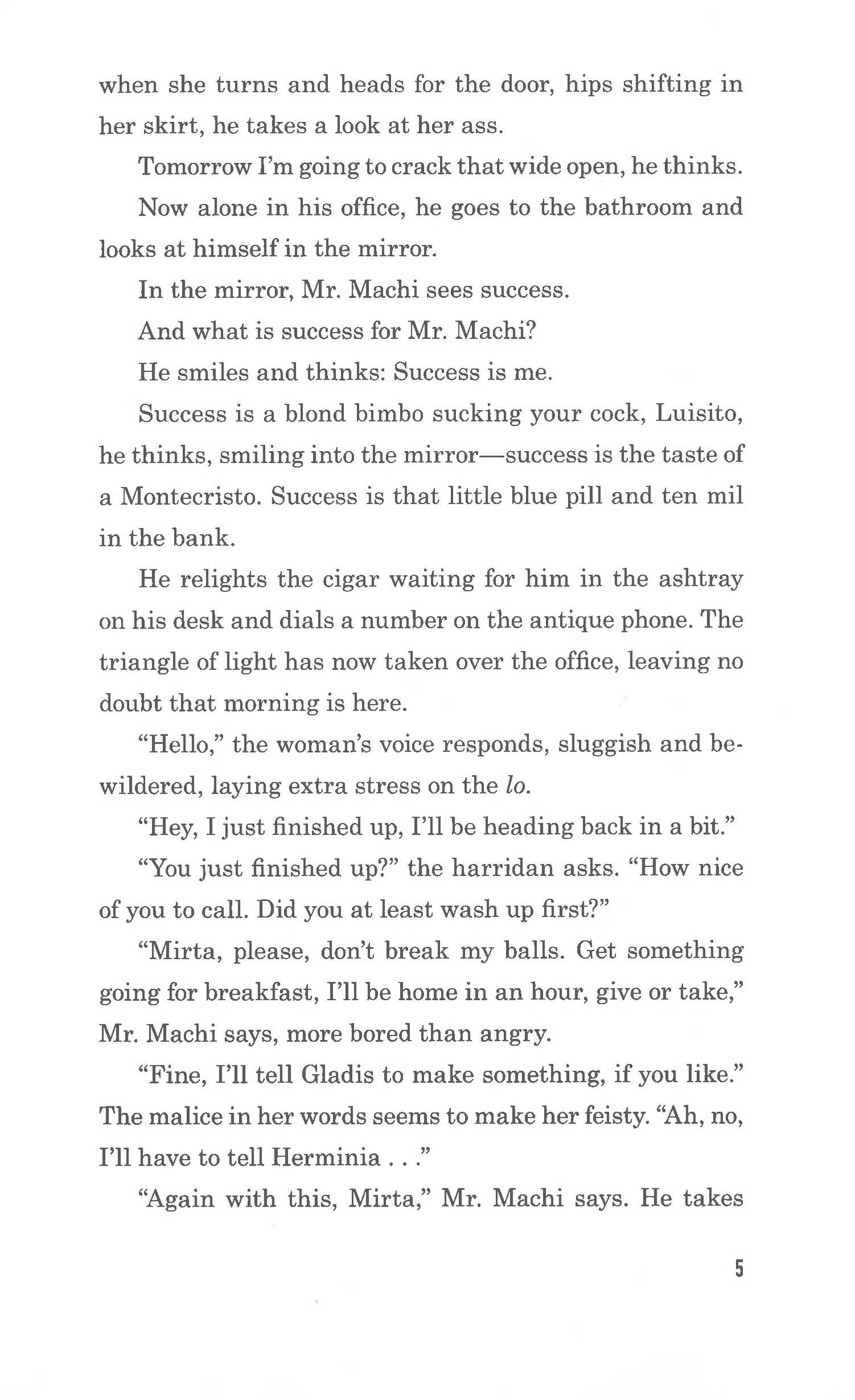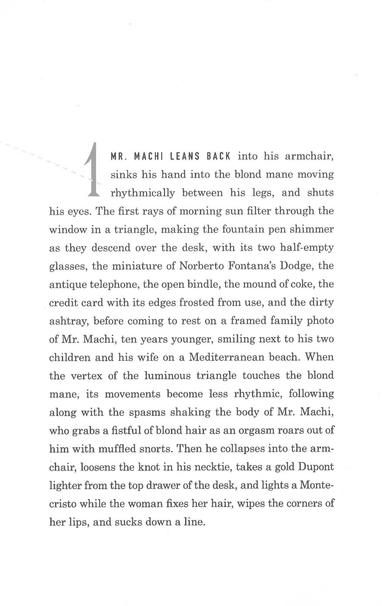 Luis Machi has had enemies for a long time: after all, he's built his success on dirty deals - not to mention his cooperation with the military junta's coup years ago, or his love life, a web of infidelities. What's new is the corpse in the boot of his car. A body with its face blown off, detained by a pair of furry pink handcuffs that Machi knows well . . .