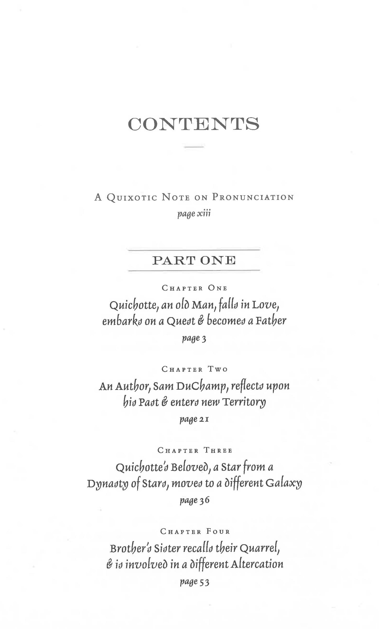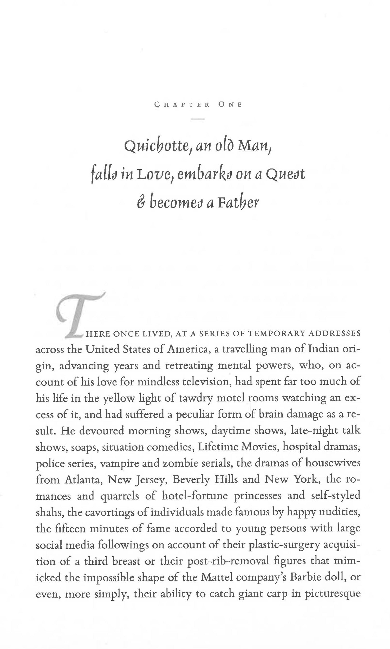 Inspired by the Cervantes classic, Sam DuChamp, mediocre writer of spy thrillers, creates Quichotte, a courtly, addled salesman obsessed with television, who falls in impossible love with the TV star Salman R. Together with his (imaginary) son Sancho, Quichotte sets off on a picaresque quest across America to prove worthy of her hand, gallantly braving the tragicomic perils of an age where 'Anything-Can-Happen'. Meanwhile his creator, in a midlife crisis, has equally urgent challenges of his own.