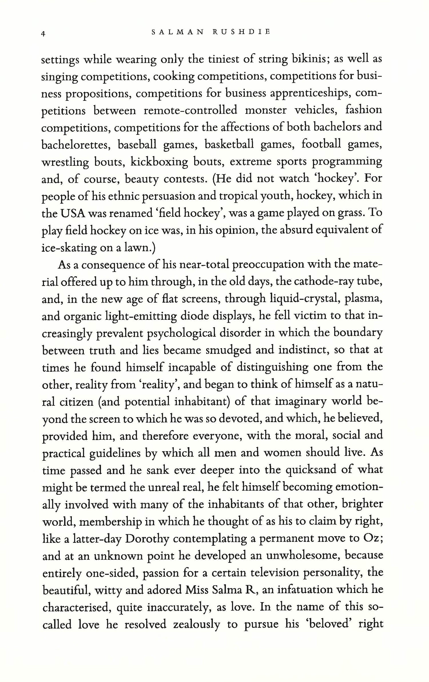 Just as Cervantes wrote Don Quixote to satirise the culture of his time, Rushdie takes the reader on a wild ride through a country on the verge of moral and spiritual collapse, with the kind of storytelling magic that is the hallmark of his work. The fully realised lives of DuChamp and Quichotte intertwine in a profoundly human quest for love and a wickedly entertaining portrait of an age in which fact is so often indiscernible from fiction.