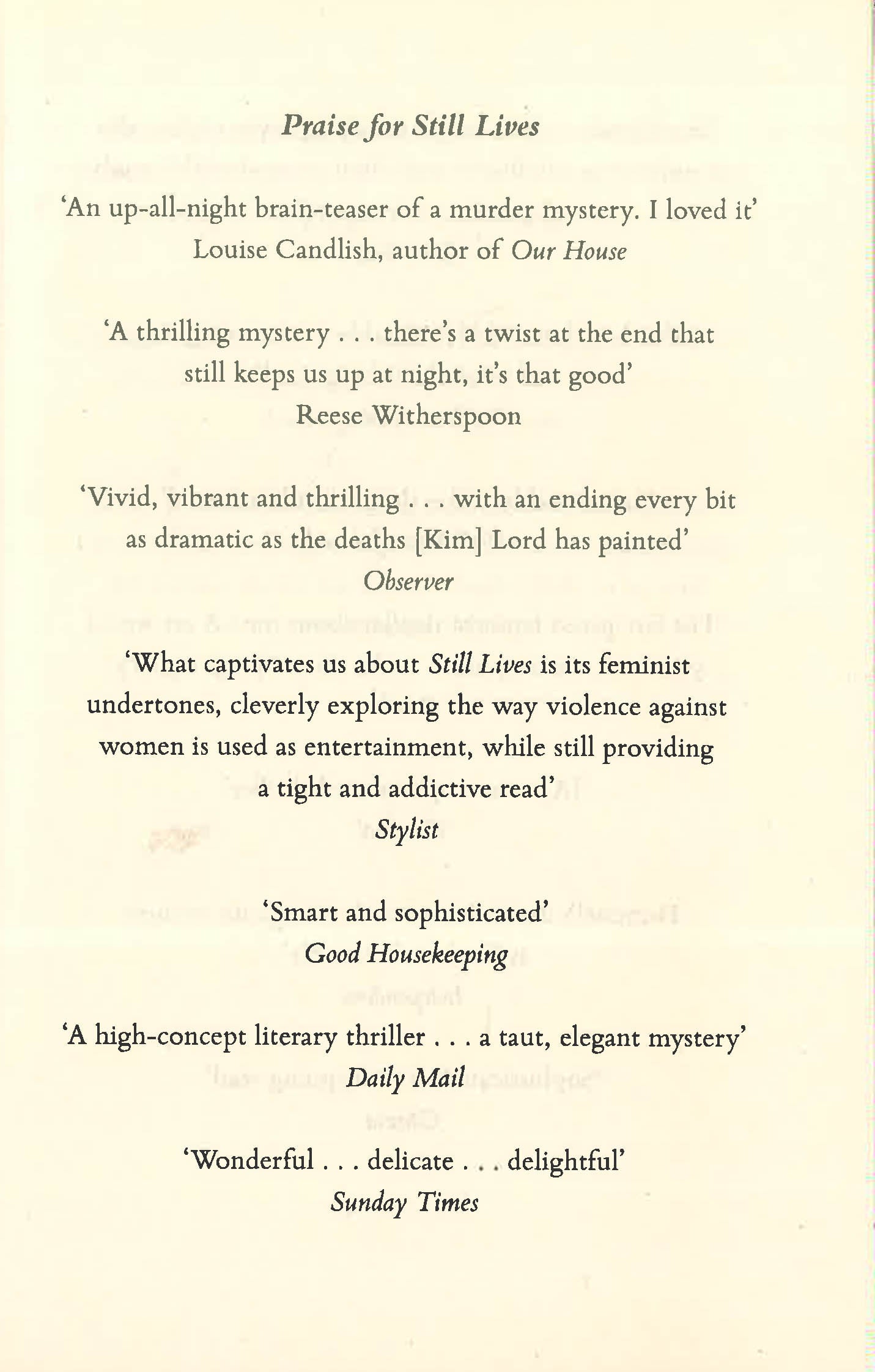 WINNER OF STYLIST BOOK WARSA SUNDAY TIMES CRIME CLUB PICKTHE POOL'S BEDTIME BOOK CLUB PICKSHORTLISTED FOR AMAZON'S BEST MYSTERY/THRILLER OF THE YEAR A REESE WITHERSPOON BOOK CLUB PICK'Thrilling' Reese Witherspoon'Addictive' Stylist'Vibrant' Observer'Sensational' Guardian 'Elegant' Daily Mail'Wonderful' Sunday Times'Compelling' Entertainment Weekly'Lyrical' Wall Street Journal'Gripping' Bustle'Stunning' LA Times'Smart' Good Housekeeping'Sophisticated' Grazia'Ice-pick sharp' Louise CandlishAs the party of the year gets underway, celebrities and patrons pour into the Rocque Museum to see Kim Lord - L.A.'s artist of the moment - stabbed, strangled, shot, and beaten. It's the opening night of 'Still Lives', Kim's new collection of shockingly graphic self-portraits, in which she impersonates the victims of America's most famous homicides, from Nicole Brown Simpson to the Black Dahlia.Among those gathered is Maggie Richter, a museum editor whose ex, Greg Shaw Ferguson, is in a relationship with Kim. When Kim fails to appear at the party and is declared officially missing, Greg is arrested on suspicion of murder. Suddenly, Maggie finds herself drawn into an investigation of her own, haunted by the thought that Kim has suffered the same terrible fate as the women in her paintings. 'Think a mix of Killing Eve and . . . one of those thrillers that keeps you up till 2am when you've a 6am alarm and you're close to the mark' Stylist 'An up-all-night brain-teaser of a murder mystery. I loved it' Louise Candlish, author of Our HousePerfect for fans of The Girls, Gone Girl and Big Little Lies.