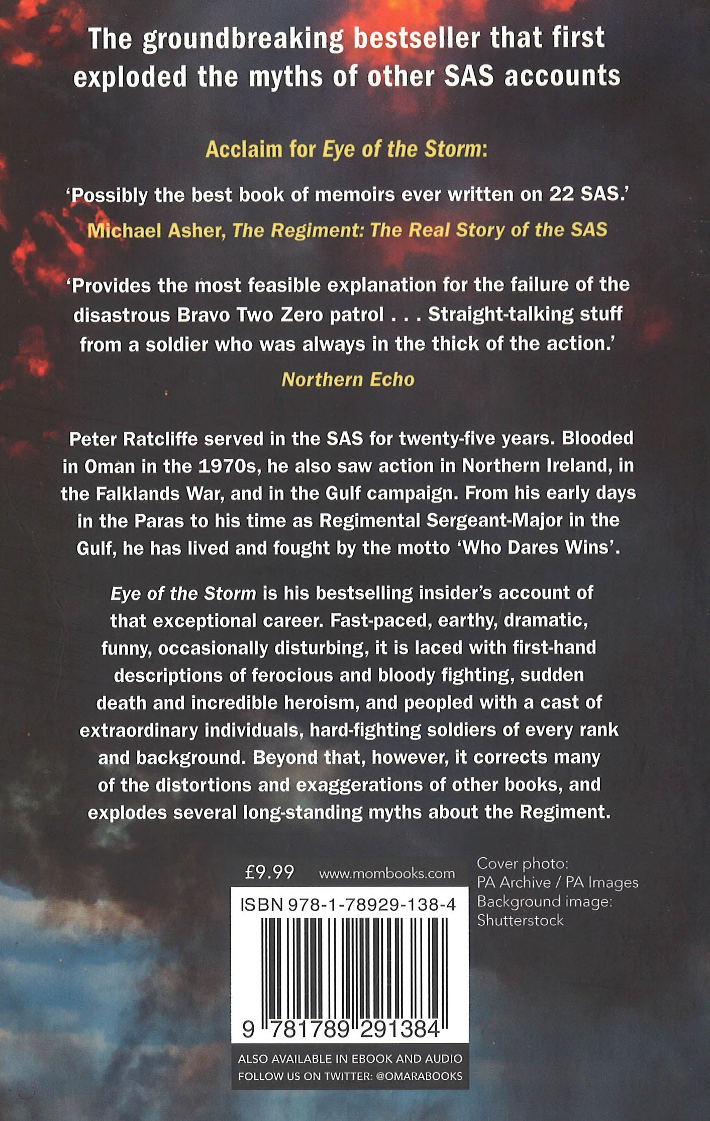 Peter Ratcliffe served in the SAS for twenty-five years. Blooded in Oman in the 1970s, he also saw action in Northern Ireland, in the Falklands War, and in the Gulf campaign. From his early days in the Paras to his time as Regimental Sergeant-Major in the Gulf, he has lived and fought by the motto 'Who Dares Wins'. Eye of the Storm is Ratcliffe's insider's account of that exceptional career. Fastpaced, earthy, dramatic, funny, occasionally disturbing, it is laced with firsthand descriptions of ferocious and bloody fighting, sudden death and incredible heroism, and peopled with a cast of extraordinary individuals. Beyond that, however, it corrects many of the distortions and exaggerations of other books, and explodes several long-standing myths about the Regiment. Here - at last - is the authentic voice of the SAS.