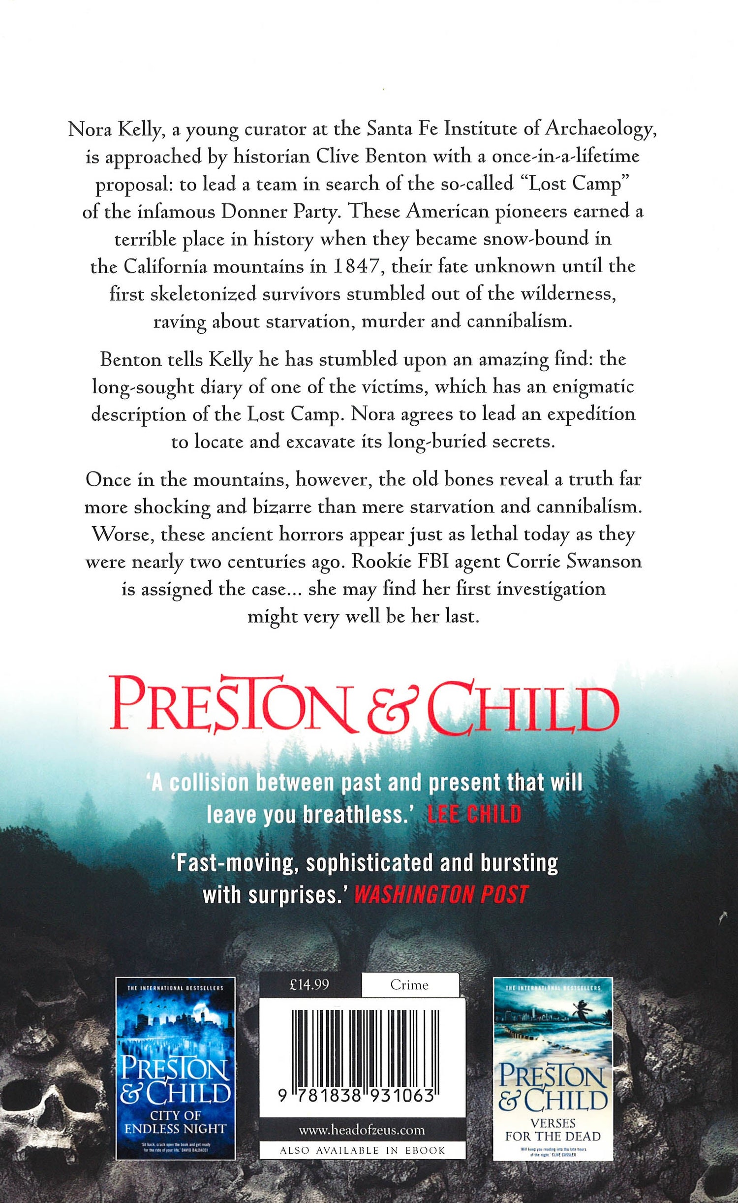 Nora Kelly, a young curator at the Santa Fe Institute of Archaeology, is approached by historian Clive Benton with a once-in-a-lifetime proposal: to lead a team in search of the so-called 'Lost Camp' of the tragic Donner Party. This was a group of pioneers who earned a terrible place in American history when they became snow-bound in the California mountains in 1847, their fate unknown until the first skeletonized survivors stumbled out of the wilderness, raving about starvation, murder-and cannibalism.