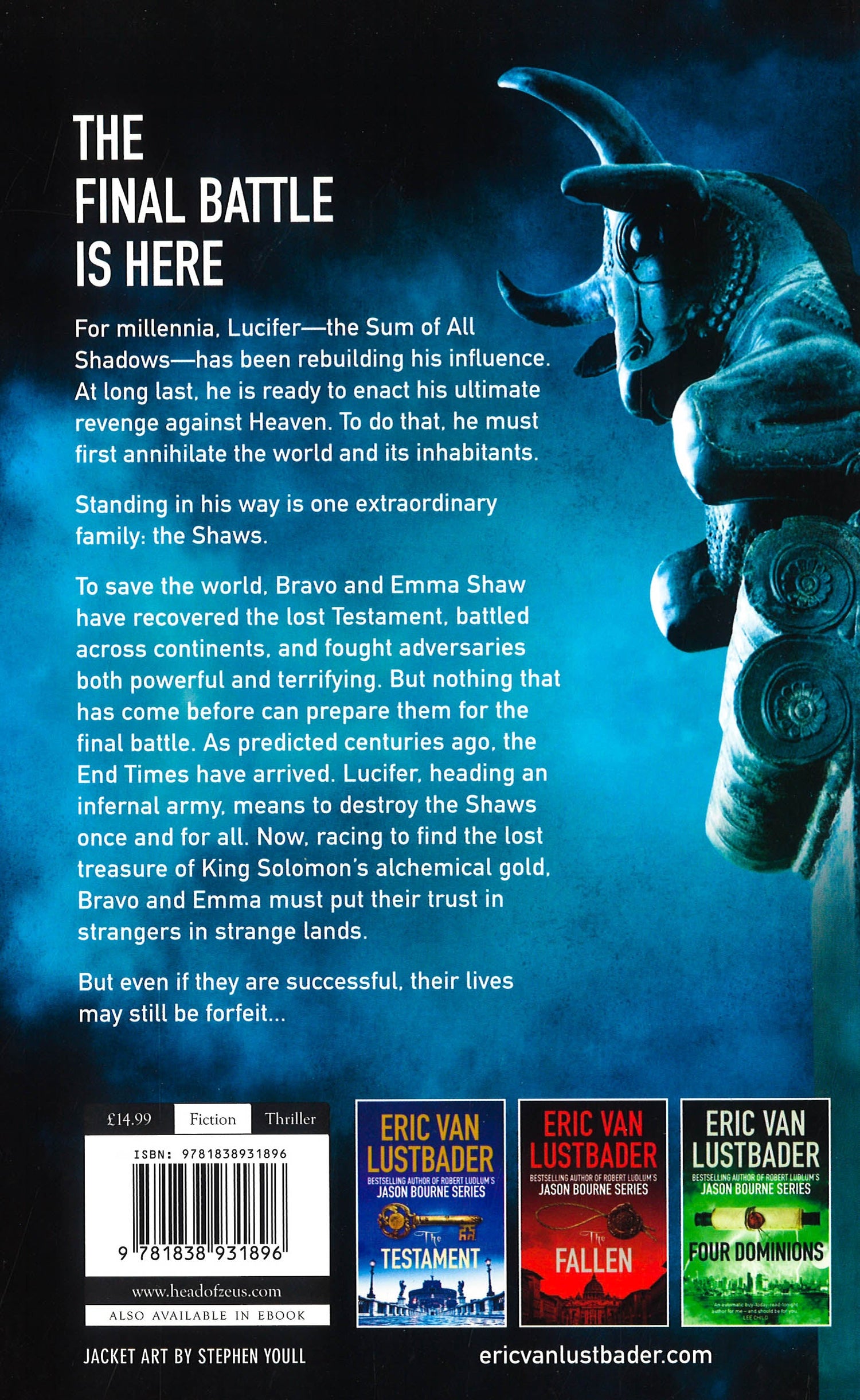 THE FINAL BATTLE IS HERE. For millennia, Lucifer - the Sum of All Shadows - has been rebuilding his influence. At long last, he is ready to enact his ultimate revenge against Heaven. To do that, he must first annihilate the world and its inhabitants. But one extraordinary family stands in his way. To save the world, Bravo and Emma Shaw have recovered the lost Testament, battled across continents, and fought adversaries both powerful and terrifying. But nothing that has come before can prepare them for the final battle. As predicted centuries ago, the End Times have arrived. Lucifer, heading an infernal army, means to destroy the Shaws once and for all. Now, racing to find the lost treasure of King Solomon's alchemical gold, Bravo and Emma must put their trust in strangers in strange lands. But even if they are successful, their lives may still be forfeit...