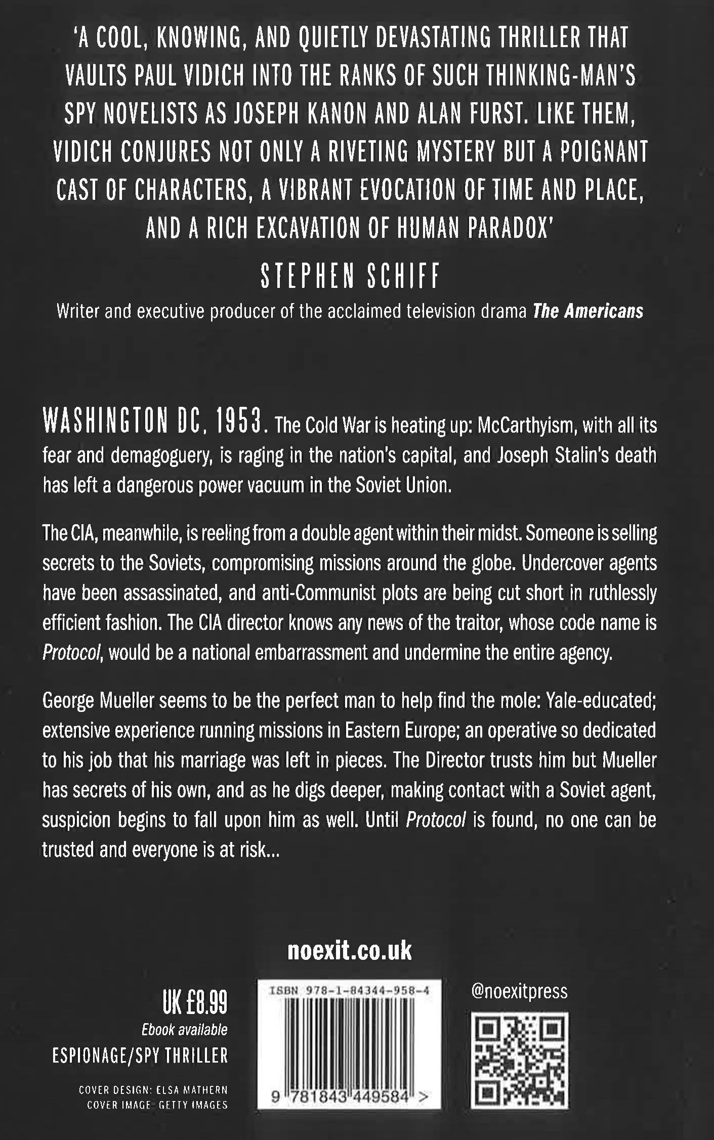 George Mueller seems to be the perfect man to help find the mole: Yale-educated; extensive experience running missions in Eastern Europe; an operative so dedicated to his job that it left his marriage in tatters. The Director trusts him but Mueller has secrets of his own and as he digs deeper, making contact with a Soviet agent, suspicion begins to fall on him as well. Until Protocol is found, no one can be trusted and everyone is at risk . . .