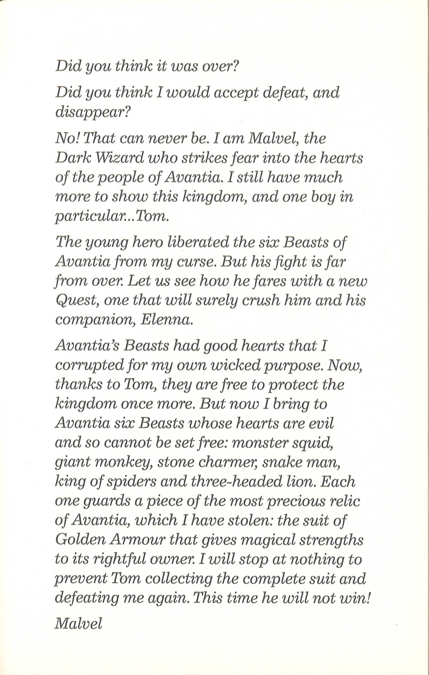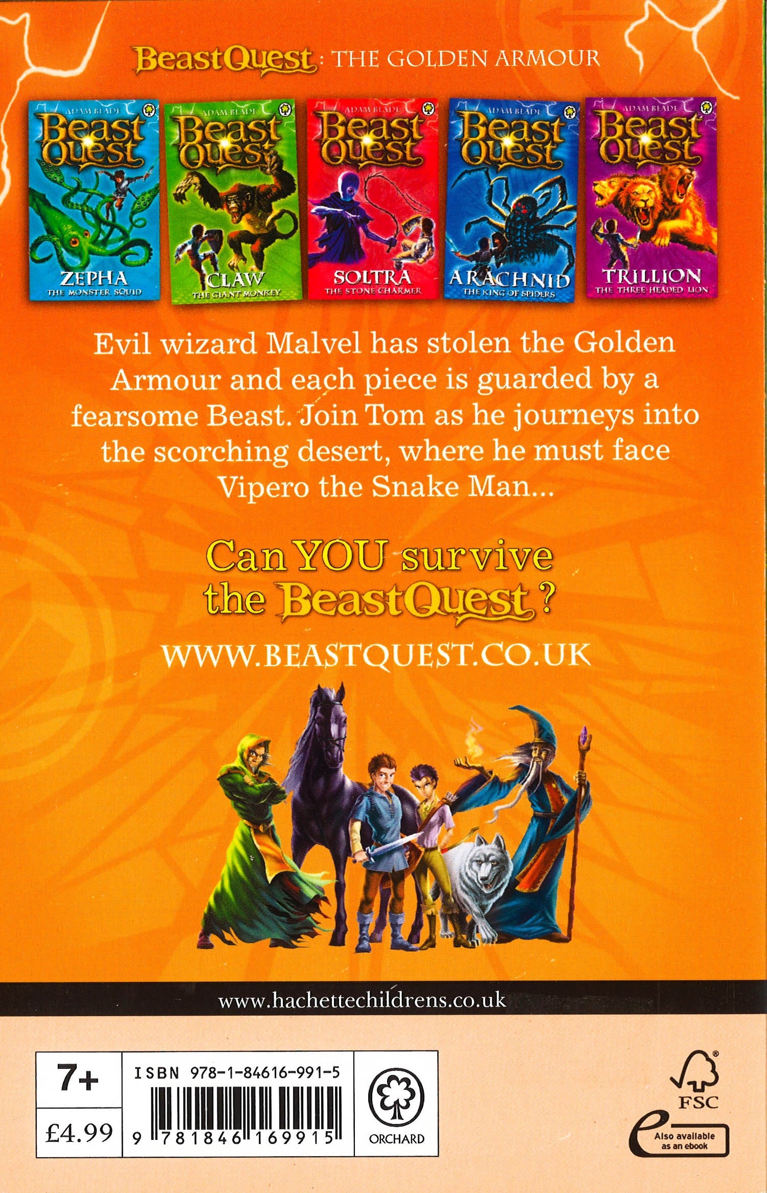 Battle fearsome beasts and fight evil with Tom and Elenna in the bestselling adventure series for boys and girls aged 7 and up. The Evil Wizard Malvel has stolen the magical suit of golden armour and scattered it throughout Avantia. Tom vows to find the pieces - but they are guarded by six terrifying new Beasts! Join Tom as he journeys into the deadly heat of the desert, where he must do battle with Vipero the Snake Man...There are SIX thrilling adventures to collect in the Beast Quest: The Golden Armour series: Zepha the Monster Squid; Claw the Giant Monkey; Soltra the Stone Charmer; Vipero the Snake Man; Arachnid the King of Spiders; Trillion the Three-Headed Lion.If you like Beast Quest, check out Adam Blade's other series: Team Hero, Sea Quest and Beast Quest: New Blood!