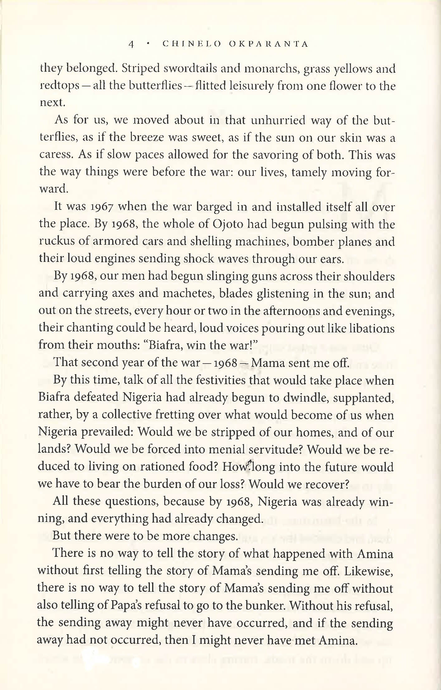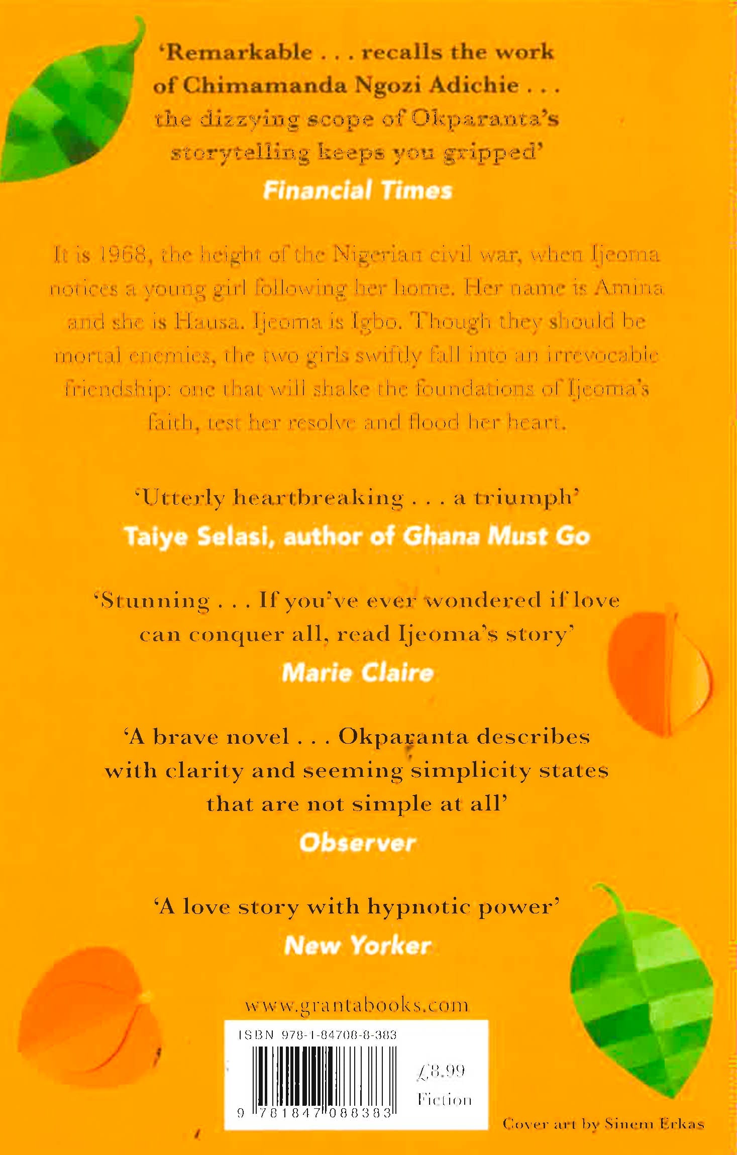 One day in 1968, at the height of the Biafran civil war, Ijeoma's father is killed and her world is transformed forever. Separated from her grief-stricken mother, she meets another young lost girl, Amina, and the two become inseparable. Theirs is a relationship that will shake the foundations of Ijeoma's faith, test her resolve and flood her heart.