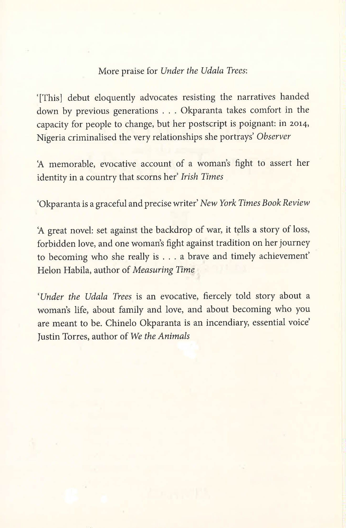 "Okparanta is major new voice not only because of her mesmerizing storytelling, but for her bravery and originality. She is a truth teller and soothsayer... Under the Udala Trees is breathtaking, rich with history and heart" - Tayari Jones