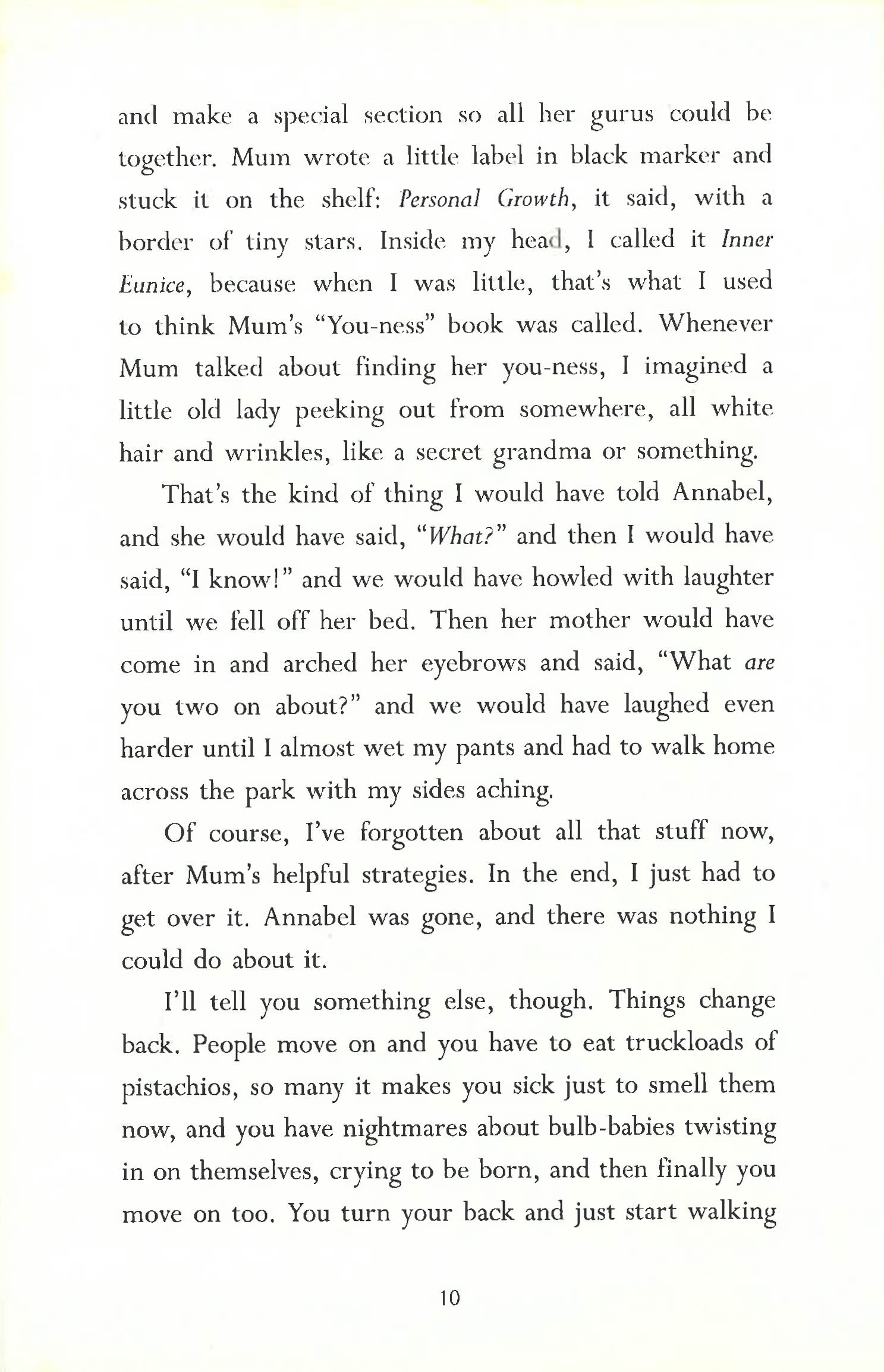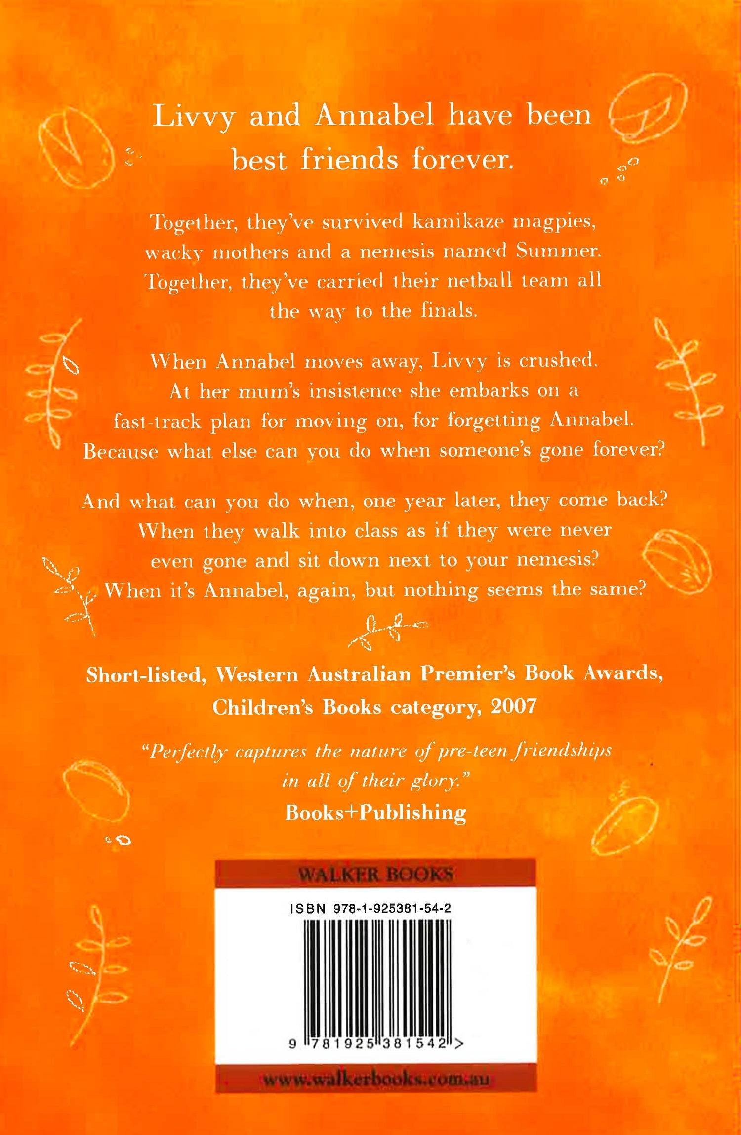 Livvy and Annabel have been best friends forever. Together, they've survived kamikaze magpies, wacky mothers and a nemesis named Summer. Together, they've carried their netball team all the way to the finals. When Annabel moves away, Livvy is crushed. At her mum's insistence she embarks on a fast-track plan for moving on, for forgetting Annabel. Because what else can you do when someone's gone forever? And what can you do when, one year later, they come back? When they walk into class as if they were never even gone and sit down next to your nemesis? When it's Annabel, again, but nothing seems the same?V