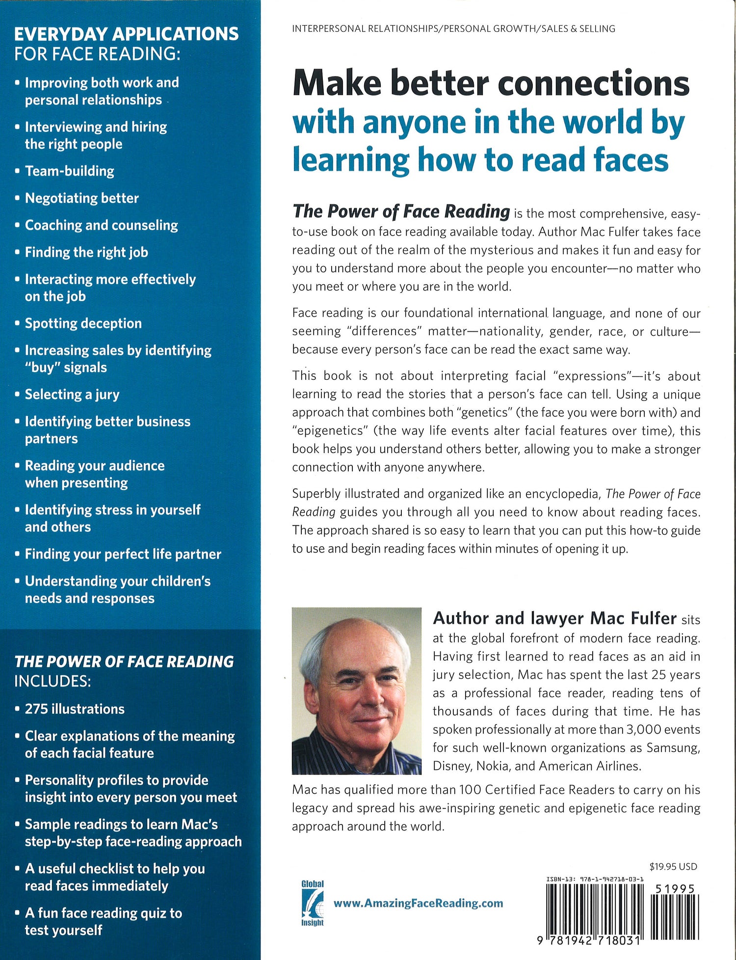 - Rohit S. "Of all the options out there for face reading, this book is the clearest and simplest, with great illustrations. Allows you to understand people on a deeper level. A fun book and makes a great gift or a party activity!" - Jag G. "I love this book! Now that I have it, I find myself noticing faces in more detail than ever before. Interesting and just plain fun! You'll be reading faces everywhere you go."- Sherri R. Author and lawyer Mac Fulfer sits at the global forefront of modern face reading. Having first learned to read faces as an aid in jury selection, Mac has spent the last 25 years as a professional face reader, reading tens of thousands of faces during that time. He has spoken professionally at more than 3,000 events for such well-known organizations as Samsung, Disney, Nokia, and American Airlines. Mac has qualified more than 100 Certified Face Readers to carry on his legacy and spread his awe-inspiring genetic and epigenetic face reading approach around the world.