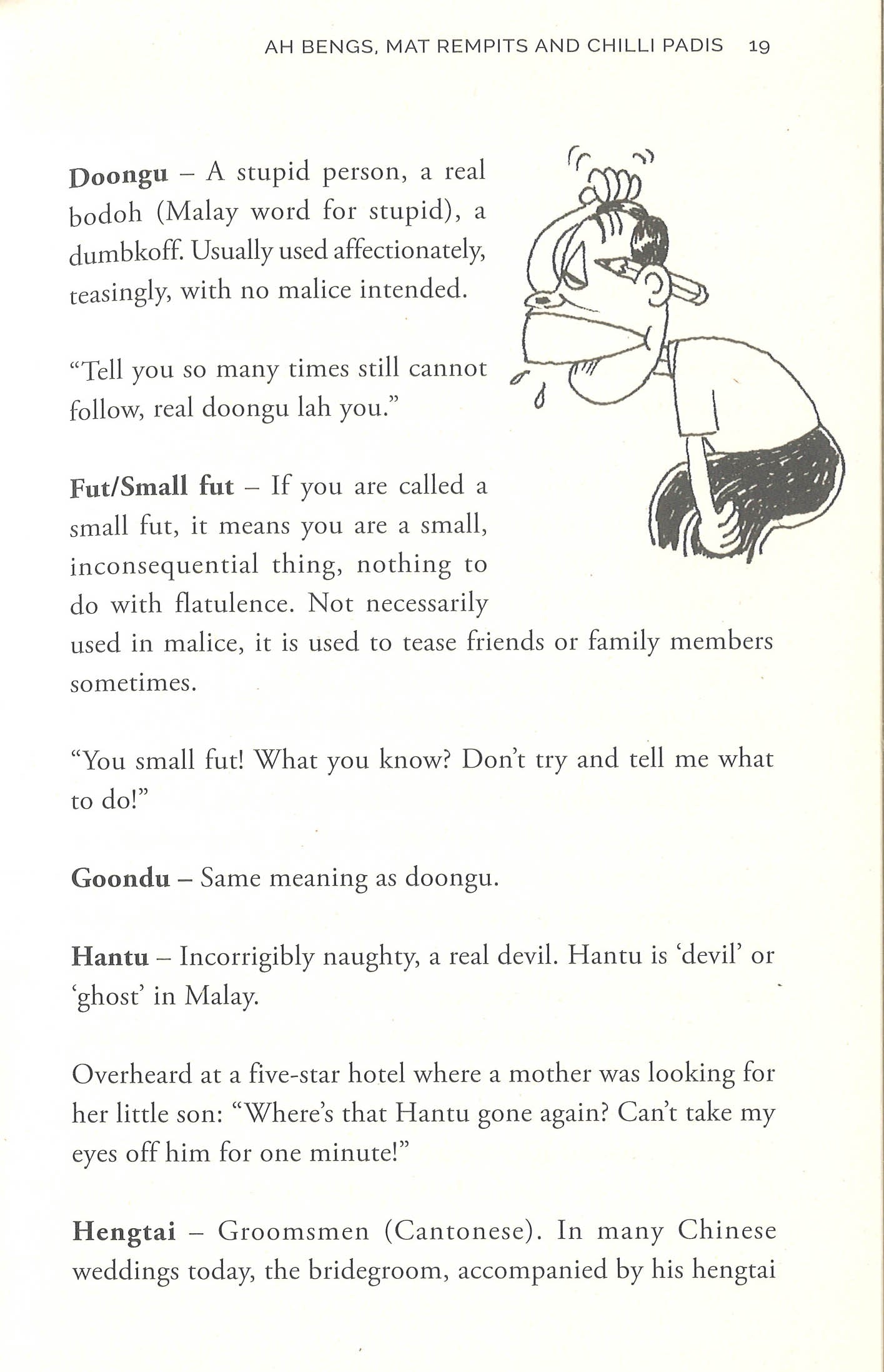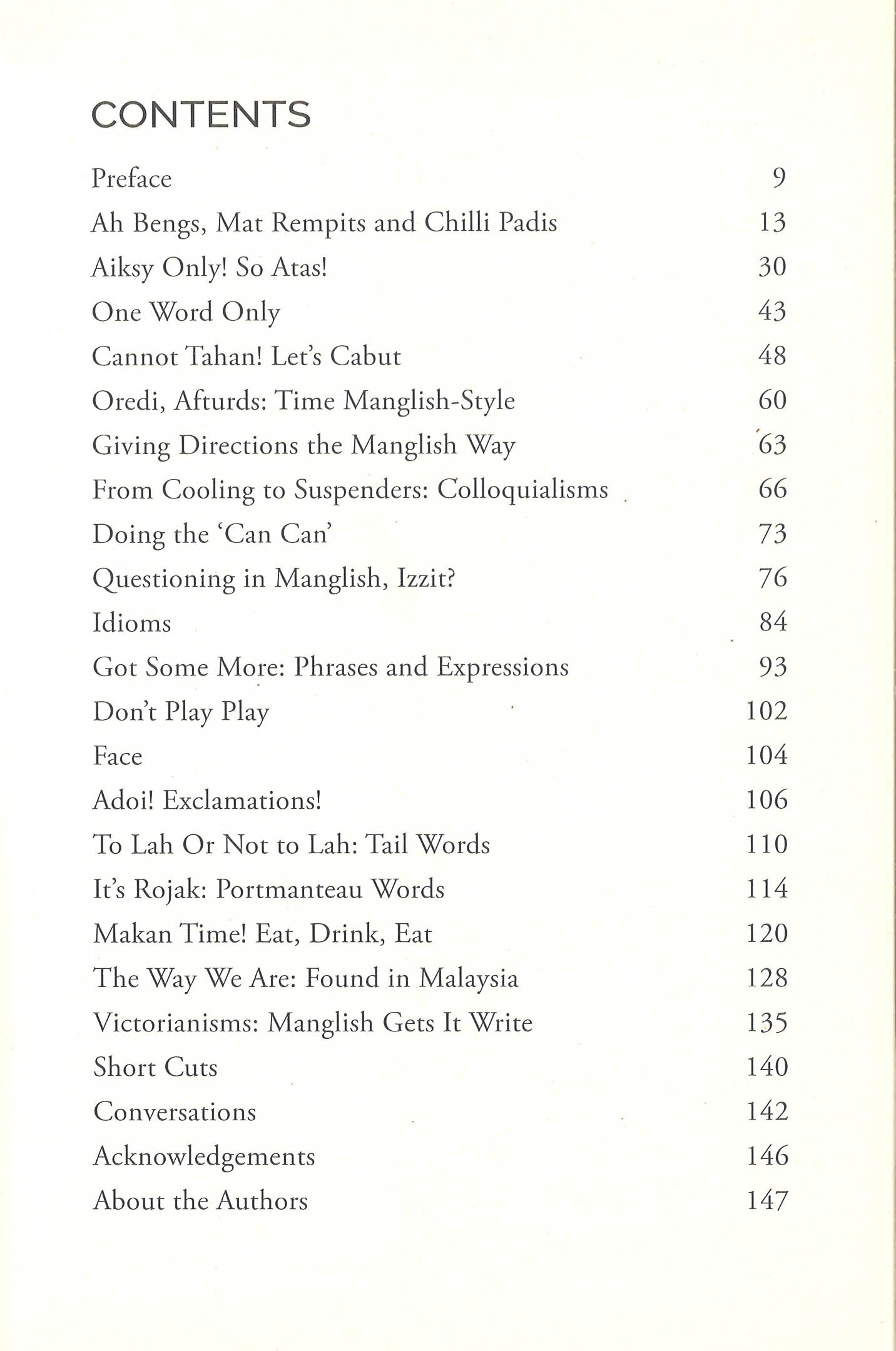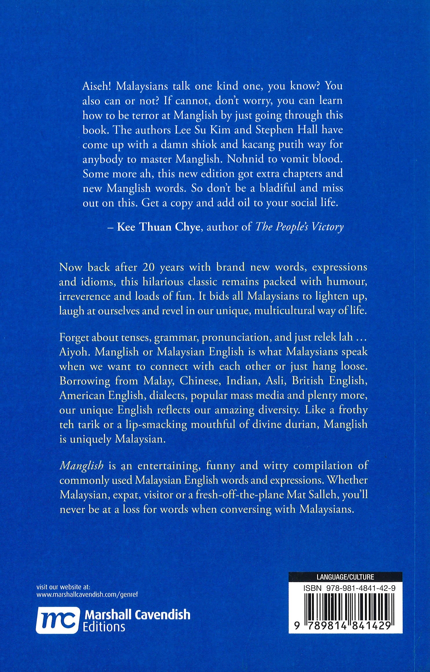 Now back after 20 years with brand new words, expressions and idioms, this hilarious classic remains packed with humour, irreverence and loads of fun. It bids all Malaysians to lighten up, laugh at ourselves and revel in our unique, multicultural way of life. Forget about tenses, grammar, pronunciation, and just relek lah … Aiyoh. Manglish or Malaysian English is what Malaysians speak when we want to connect with each other or just hang loose. Borrowing from Malay, Chinese, Indian, Asli, British English, American English, dialects, popular mass media and plenty more, our unique English reflects our amazing diversity. Like a frothy teh tarik or a lip-smacking mouthful of divine durian, Manglish is uniquely Malaysian. Manglish is an entertaining, funny and witty compilation of commonly used Malaysian English words and expressions. Whether Malaysian, expat, visitor or a fresh-off-the-plane Mat Salleh, you’ll never be at a loss for words when conversing with Malaysians.