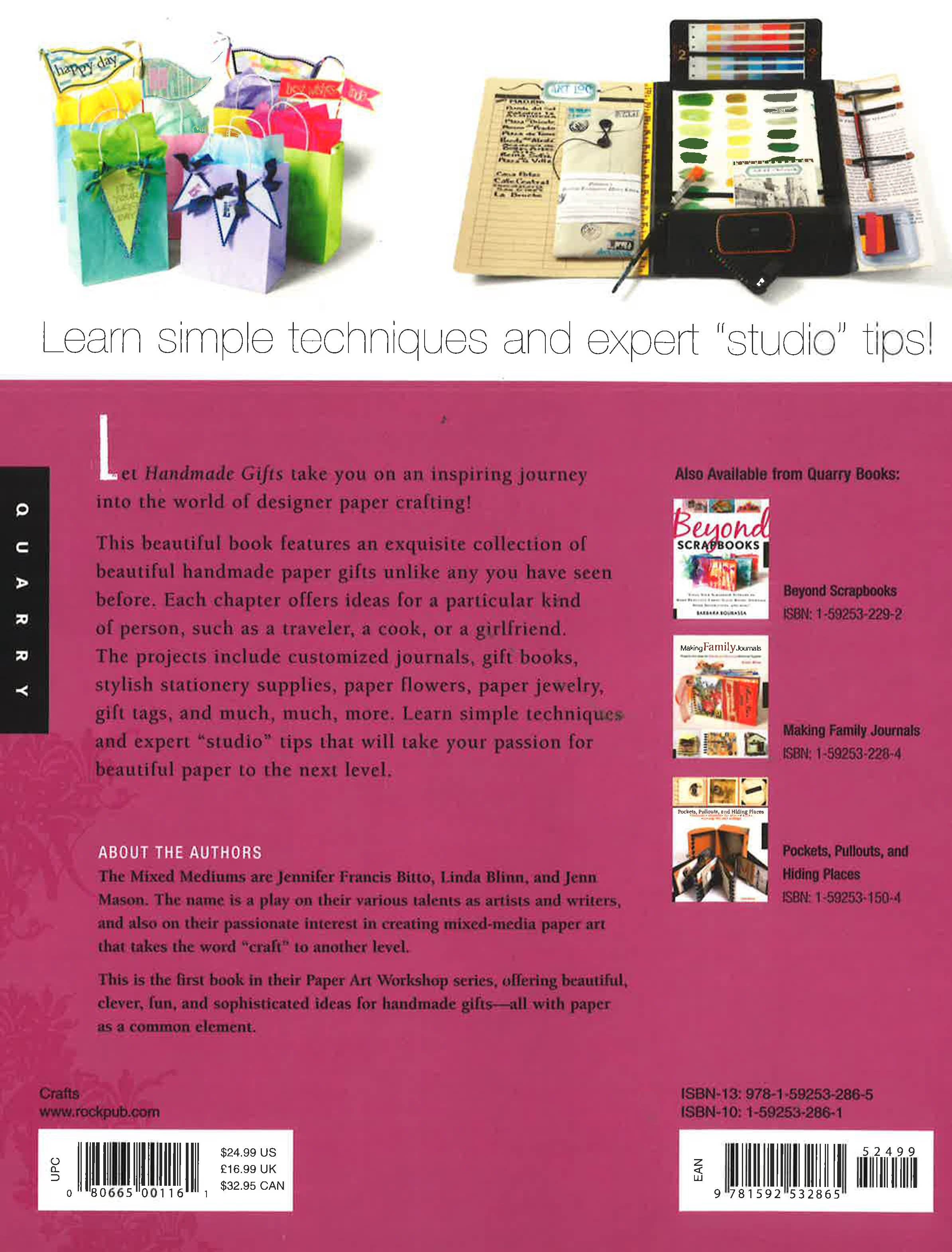 Book Description Exquisite paper-based gifts that everyone will love. Giving handmade gifts is always in style! And these personalized gifts are more meaningful than most store-bought items, especially in today's world of homogeneous merchandise. Crafters have delved into a celebration of personalized work and this book offers a wide range of beautiful paper-based projects to help them expand their creative skills. Projects include luggage tags, a travel frame, a travel journal, collage under glass (paper weight), custom stationery items, book plates, personalized pens and tabs, a kitchen journal, tags and labels for food gifts, collage plates, paper art produce and more. This inspiring new book is the first in a series of volumes targeted to the large and growing paper arts/memory/book making audience. Each book in the series, including Celebrating Baby, features sophisticated techniques and paper art projects for stylish crafters. Celebrating popular craft themes, from babies to home to gift giving to crafts for parties and entertaining, Handmade Gifts features projects that are contemporary, artistic and stylish, and that utilize the latest trends and techniques in paper arts.Giving handmade gifts is always in style! And these personalized gifts are more meaningful than most store-bought items, especially in today's world of homogeneous merchandise. Crafters have delved into a celebration of personalized work and this book offers a wide range of beautiful paper-based projects to help them expand their creative skills. Projects include luggage tags, a travel frame, a travel journal, collage under glass (paper weight), custom stationery items, book plates, personalized pens and tabs, a kitchen journal, tags and labels for food gifts, collage plates, paper art produce and more. This inspiring new book is the first in a series of volumes targeted to the large and growing paper arts/memory/book making audience. Each book in the series, including Celebrating Baby, features sophisticated techniques and paper art projects for stylish crafters. Celebrating popular craft themes, from babies to home to gift giving to crafts for parties and entertaining, Handmade Gifts features projects that are contemporary, artistic and stylish, and that utilize the latest trends and techniques in paper arts. Editorial Reviews About the Author Linda Blinn is an editor, teacher, writer, designer, and artist in the mixed-media arena. Her work as editor of Somerset Studio's M'lange focused on current trends in art journals, collage, zines and the wide spectrum of mixed media art. Her editorial credits also include work on True Colors, Signatures, and the Art Journal Calendar all published by Stampington & Co. Linda teaches in the Southern California area and at national conventions and conferences. She has also appeared on the DIY Network. Jennifer Mason's scrapbook design and paper art has been published in numerous books and leading art and scrapbook magazines. She worked as co-designer for Anna Griffin's Elegant Scrapbooking and also contributed to Sandi Genovese's Three Dimensional Scrapbooking. Her work has appeared on PBS, QVC, and HSN. She lives in Brookline, MA.