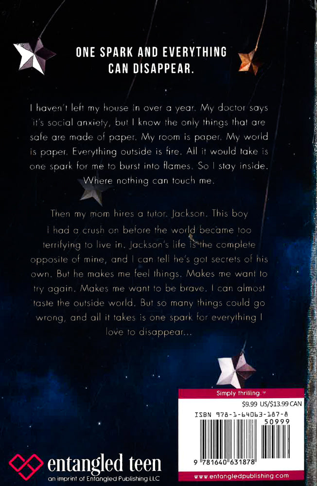 I haven't left my house in more than a year. Everything I know may as well be made of paper. My room is paper. My world is paper. Everything outside is fire. All it would take is one spark for me to burst into flames. So I stay inside. Where nothing can touch me. Then my mum hires a tutor. Jackson. The boy I had a crush on before the world became too terrifying to live in. He makes me feel things. Makes me want to try again. Makes me want to be brave. I can almost taste the outside world. But Jackson has a secret, too. And I know more than anyone how fast secrets catch fire. So many things could go wrong, and all it would take is one spark for everything I love to disappear...