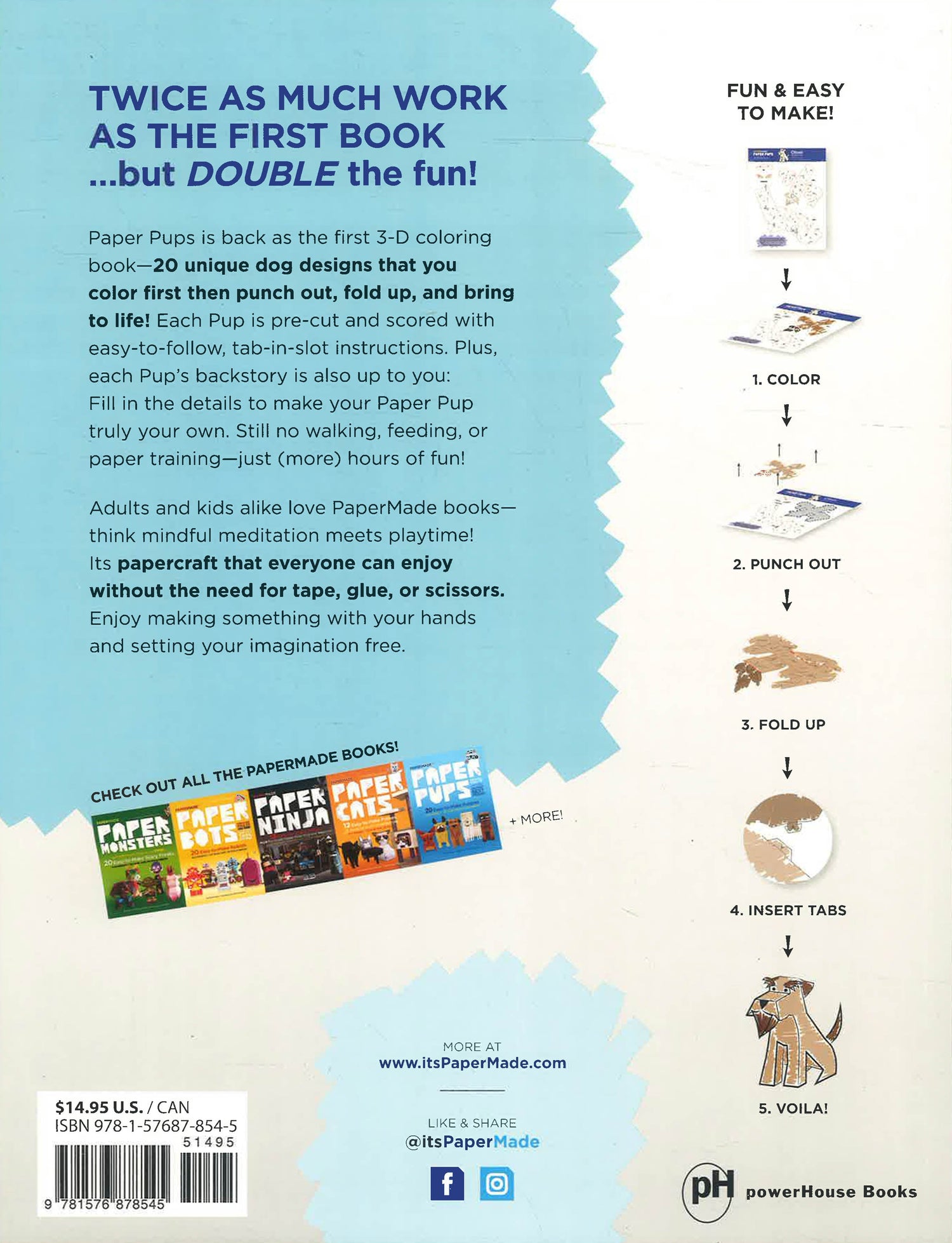 Each of the 20 pup templates are pre-cut and pre-scored so they simply punch out and fold up with easy-to-follow instructions on the page. Plus, each Pup’s story is now up to you: Fill in their back stories to make your best friend truly your own. Paper Pups 3D Coloring Book deftly combines paper craft with advanced paper engineering: No glue, tape or tools are needed!